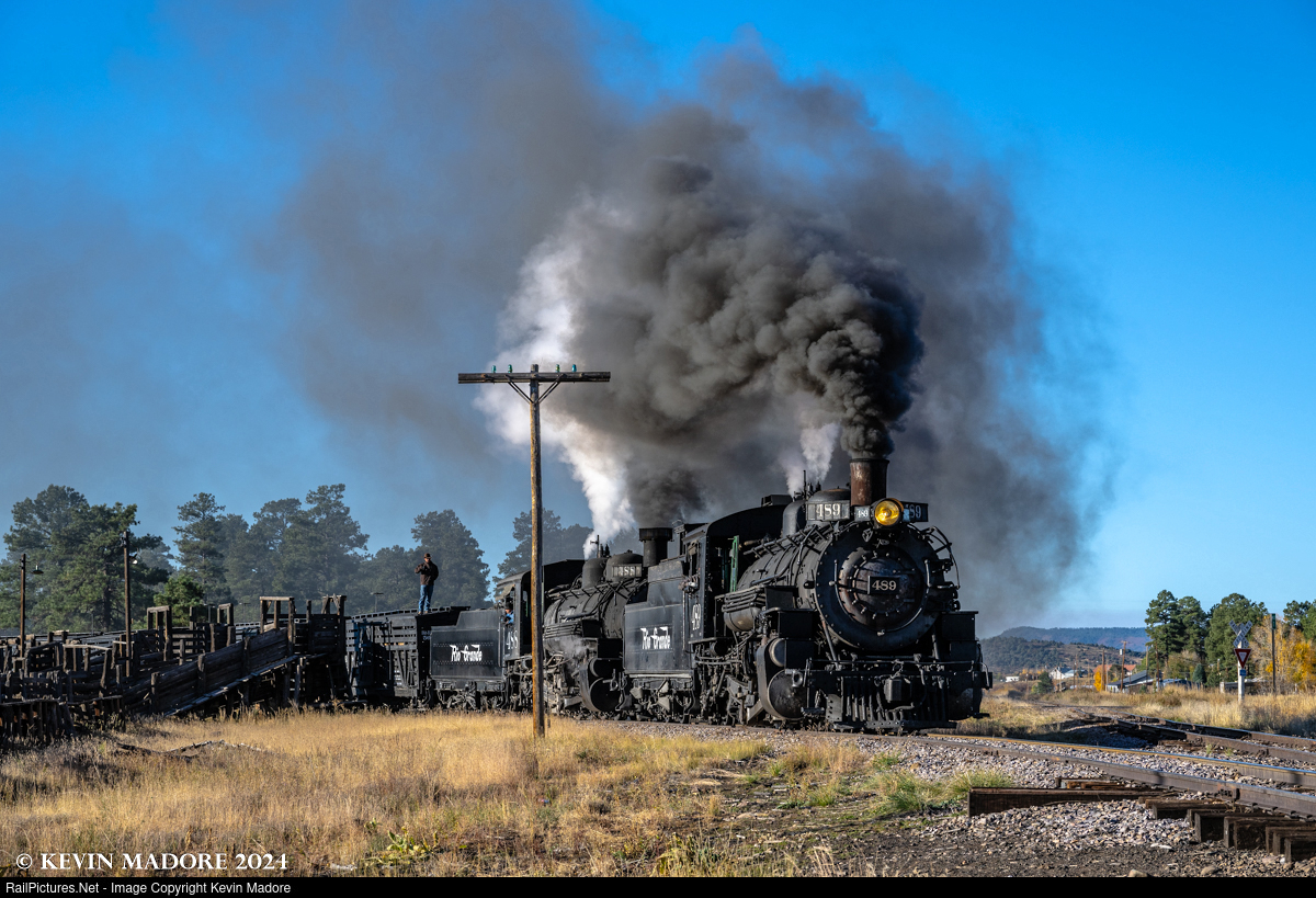 This little re-creation was staged during an October 2024 photo shoot on the Cumbres & Toltec Scenic Railroad, organized by Lerro Photography. On this particular day, the event featured a 2-engine train with K-36 locomotives #488 and 489 providing the power. In practice, a train arriving from Durango would likely have double-headed like this but would have been reconfigured in a push-pull arrangement for the trip over Cumbres Pass, to accommodate the weight restrictions on the high trestle over Wolf Creek, just outside Chama. While the Chama stock pens are still maintained as a historic artifact by the Friends of the Cumbres & Toltec, the line to Durango sadly did not survive the end of the D&RGW narrow gauge system. The line you see in this image dead-ends roughly a quarter of a mile to the southwest.
