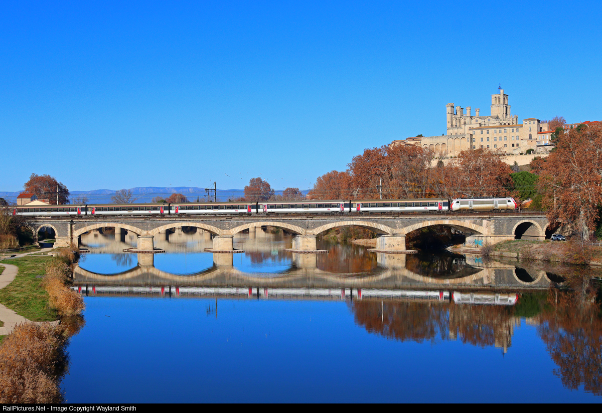 Corail Teoz service from Bordeaux to Marseille crossing the River Orb in Beziers.
