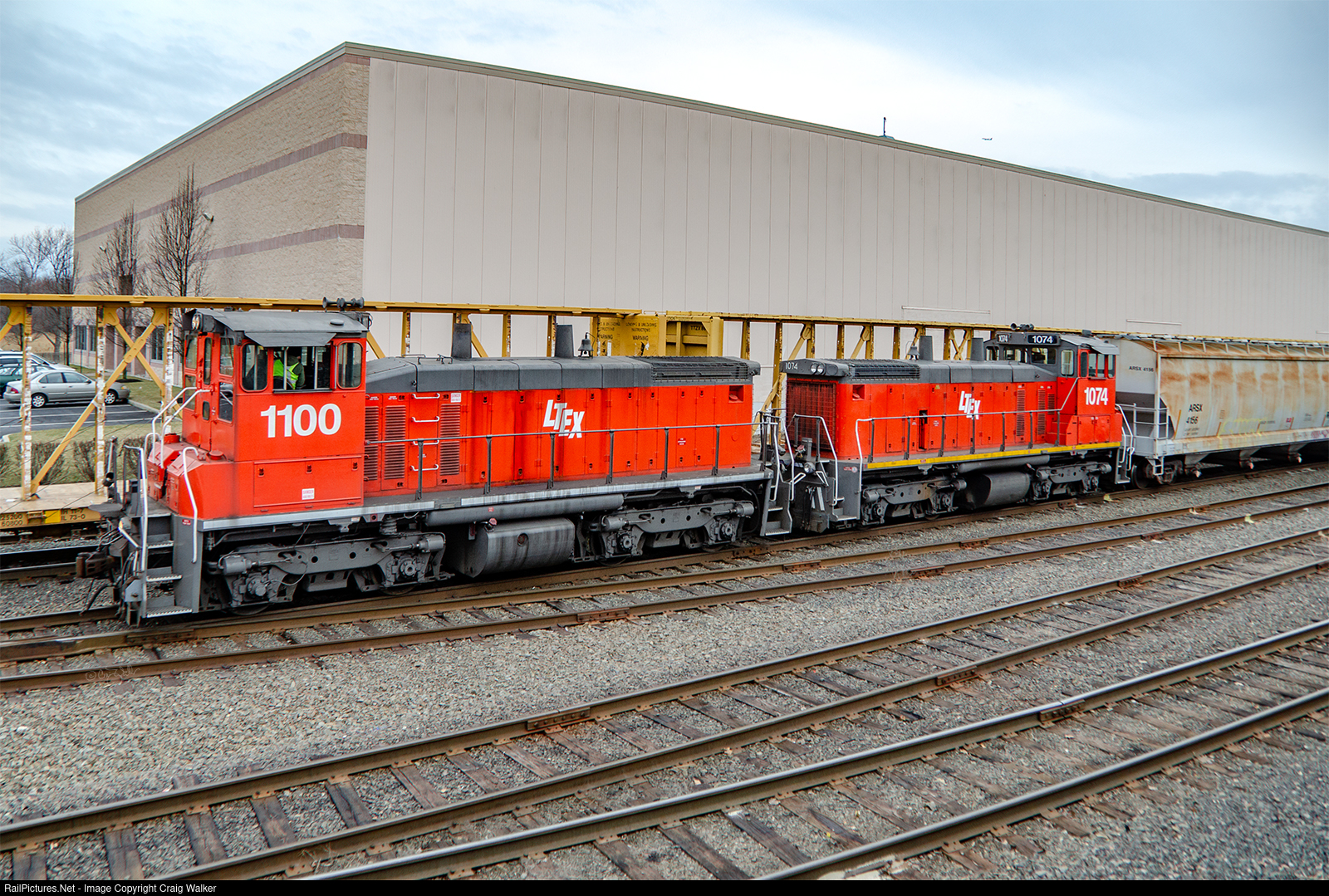 A pair of Larrys Truck Electric SW1500s, leased to the Raritan Central Railway, switch cars in the RCRY's small yard in New Jersey. LTEX 1100 was built as Southern Pacific 2507, which became Union Pacific 1100 upon the UP's acquisition of the SP. LTEX 1074 was originally SP 2468, and it became UP 1074 before being sold to LTEX. (Edison, New Jersey – March 27, 2015)