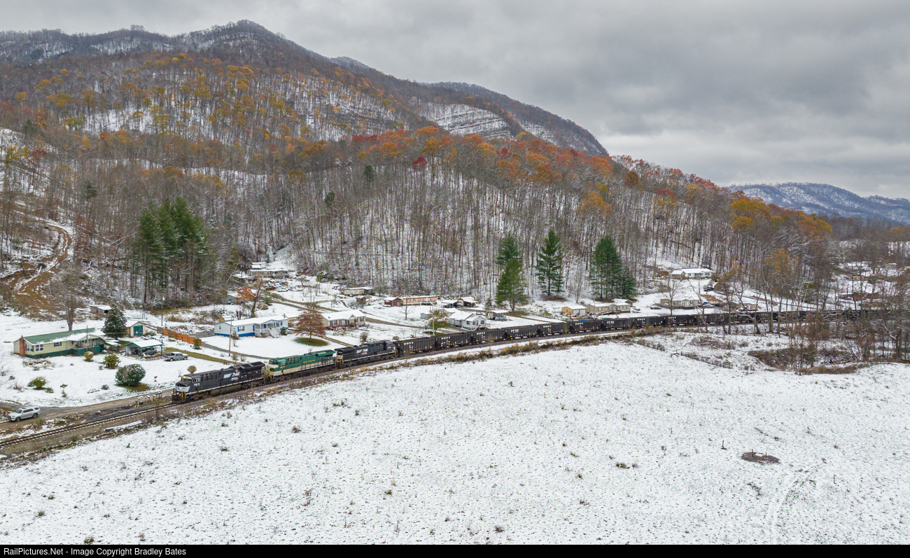 | Norfolk Southern Train U40 shuttles empty coal hoppers back west to Andover as they pass through Harvey, VA. During the first snow of the winter season across the Appalachian Mountains. |