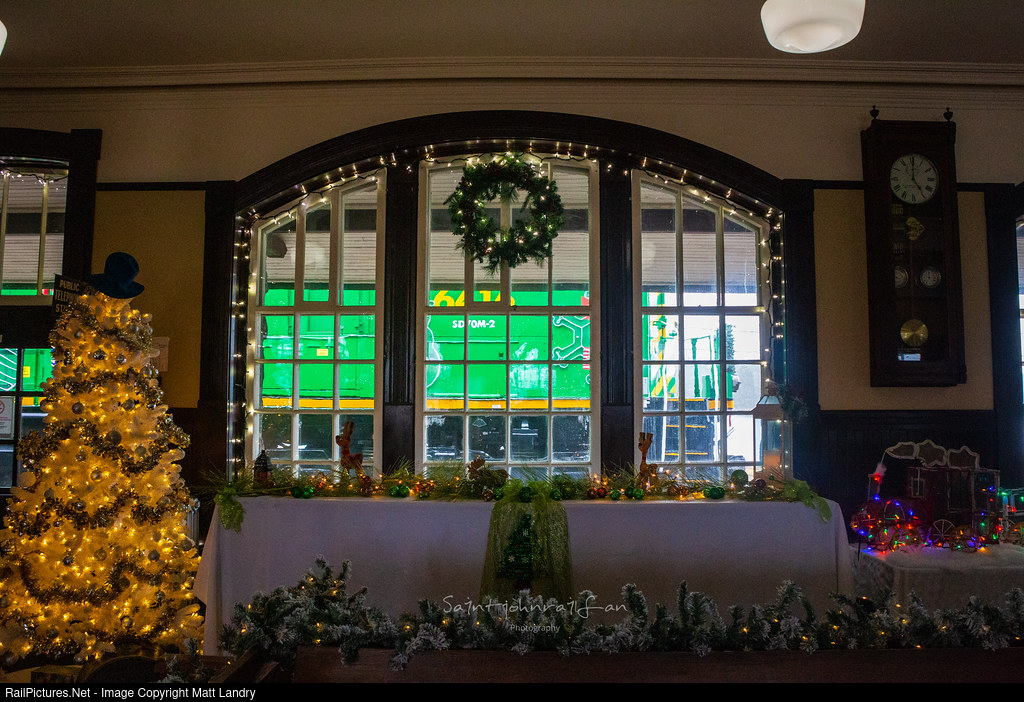 | After wying the train in McAdam, NBSR 6416 leads the CPKC holiday train, as they pass by the south side of the station in McAdam, then will pull in front for a small performance before heading west into Maine. I've never done a photo from inside the station before. Kinda neat. |