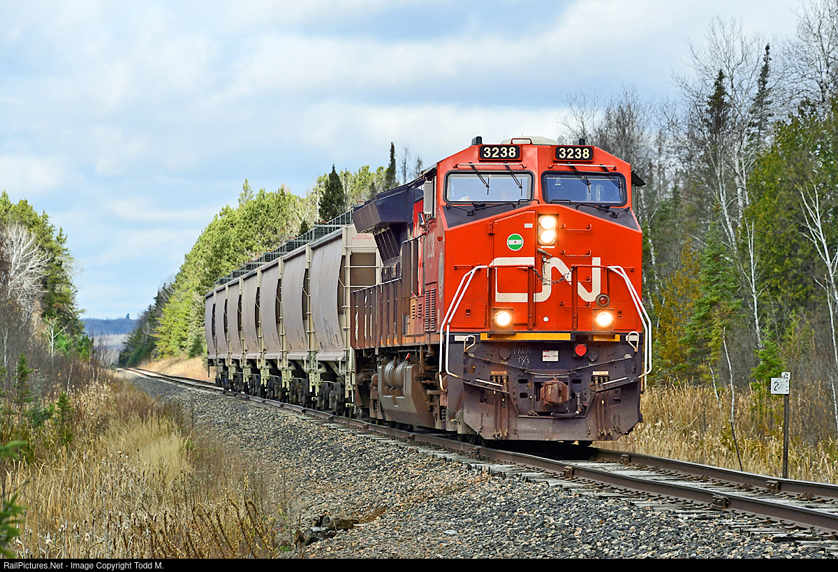| After retrieving 7 stored sand cars, CN 3238 heads past m.p. 2 on the Hinsdale Sub as they make their way back out to the CN Iron Range Sub at cp Nugget. |