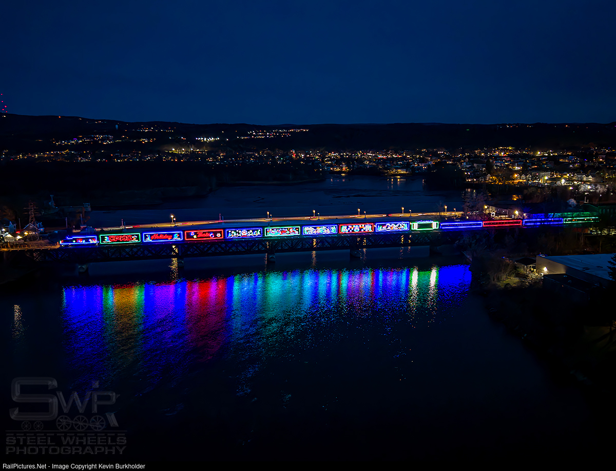 | One of the two 2024 CPKC Holiday Trains are traversing the former Delaware & Hudson Railroad today and tomorrow as the annual tradition of collecting monetary and food donations for food banks in the US and Canada gets underway. The train, led by CP GP20C-ECO 2249, is crossing the Mohawk River at Cohoes, NY on the evening of November 25. |