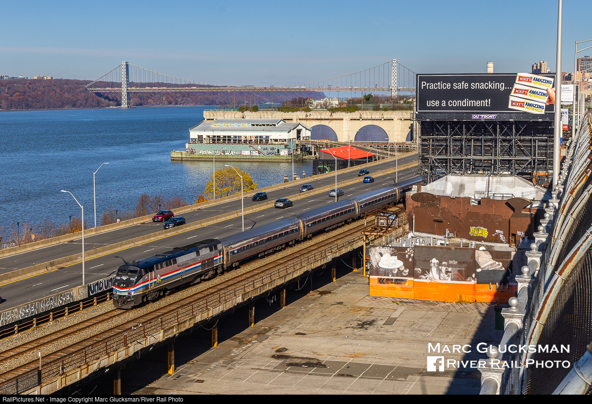 Practice Safe Snacking. On Wednesday, November 27, 2024, a very full Amtrak Train 280 is traveling its last few miles to New York Penn Station with AMTK 700 (P32AC-DM, Phase III) leading on the eve of Thanksgiving with the George Washington Bridge in the background. And speaking of food, Mike's Amazing Mayonnaise reminds travelers to practice safe snacking.....