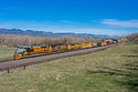 Hunt Mountain looms in the background as the sun comes up on Union Pacific train MNYPU waiting for a recrew.
