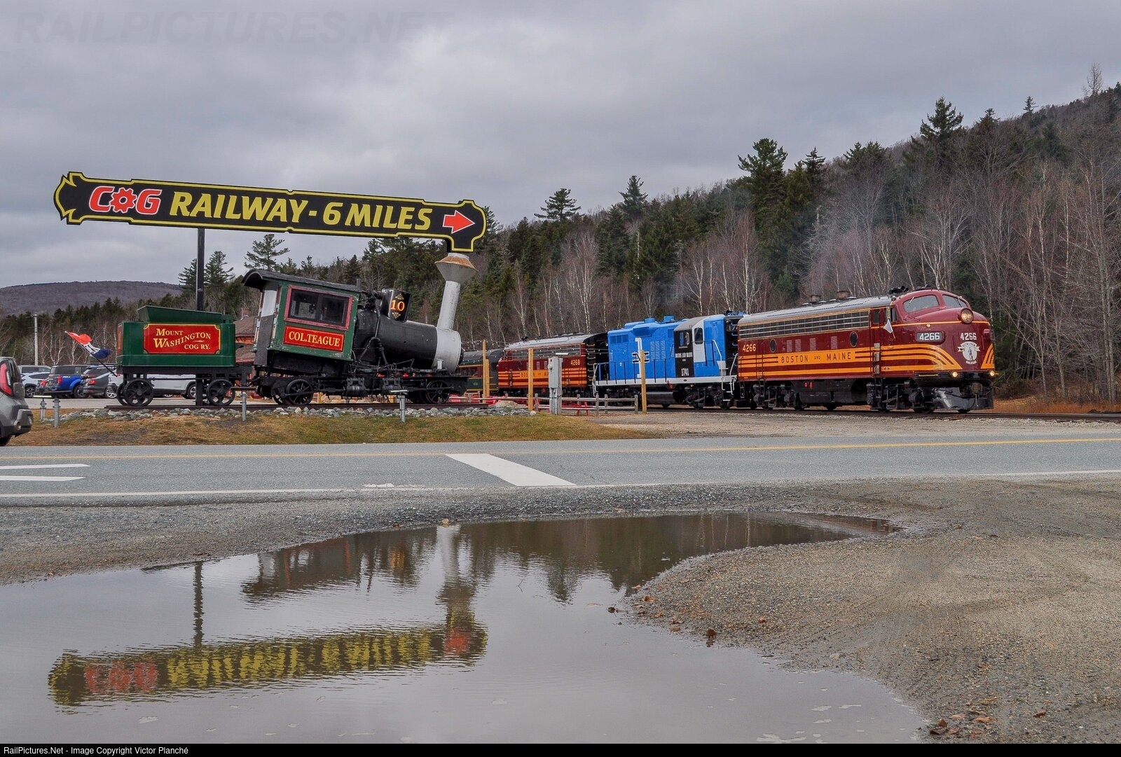 | After some switching in Fabyan's Station, 470 Railroad Club Special Train is now leaving back to Conway. On the left, the advertisement for the Mount Washington Cog Railway. |
