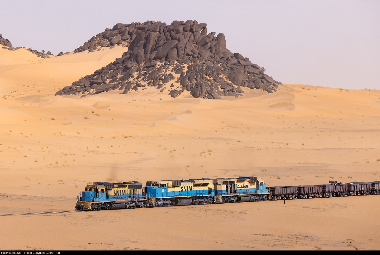 It is very surprising that there are very few photos from Mauritania on Railpictures.net yet, although diesel locomotives from the USA have been in service there for over 40 years. Let's start with a documentation of these operations. The SDL40-2 CC # 118 built by EMD in 1997 pulls the about 2 kilometer long loaded ore train of the SNIM (Société Nationale Industrielle et Minière) from Zouérat to Nouadhibou near line kilometer 404 between Choum and Ben Amira, together with the SD70ACS CC # 127 from 2012 and the SDL40-2 CC # 113 from 1993. The 650-kilometre-long standard-gauge, single-track railroad line through the Mauritanian desert was built between 1960 and 1963 to develop the ore deposits around Zouérat. The SD70ACS is a 4,500 horsepower (3,400 kW) AC variant for heavy haul freight, used in desert environments. The first 25 units were ordered for Saudi Railway Company in April 2009 and assembled in the London, Ontario, plant for delivery in the second half of 2010. Special features include a pulse filtration system, movable sand plows, EM2000 control system and FIRE display system.