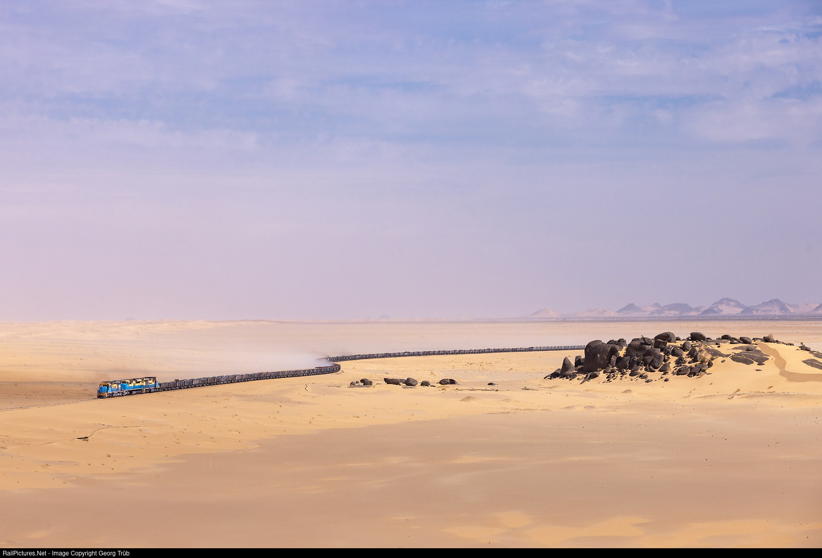 It is very surprising that there are very few photos from Mauritania on Railpictures.net yet, although diesel locomotives from the USA have been in service there for over 40 years. Let's start with a documentation of these operations. The SDL40-2 CC # 118 built by EMD in 1997 pulls the about 2 kilometer long loaded ore train, called "mineralier", of the SNIM (Société Nationale Industrielle et Minière) from Zouérate to Nouadhibou at line kilometer 405 between Choum and Ben Amira, together with the SD70ACS CC # 127 from 2012 and the SDL40-2 CC # 113 from 1993. The 652-kilometre-long standard-gauge, single-track railroad line through the Mauritanian desert was built between 1960 and 1963 to develop the ore deposits around Zouérate. Gross weight of the train is about 20000 ton. In the rear of the train are newer cars, which can load about 97 ton each (120 ton total weight). The journey from Zouérate/Fderîck to the port of Nouadhibou ist about 15 to 18 hours, often longer, with 50 km/h maximum velocity. Empty trains circulate with up to 60 km/h.