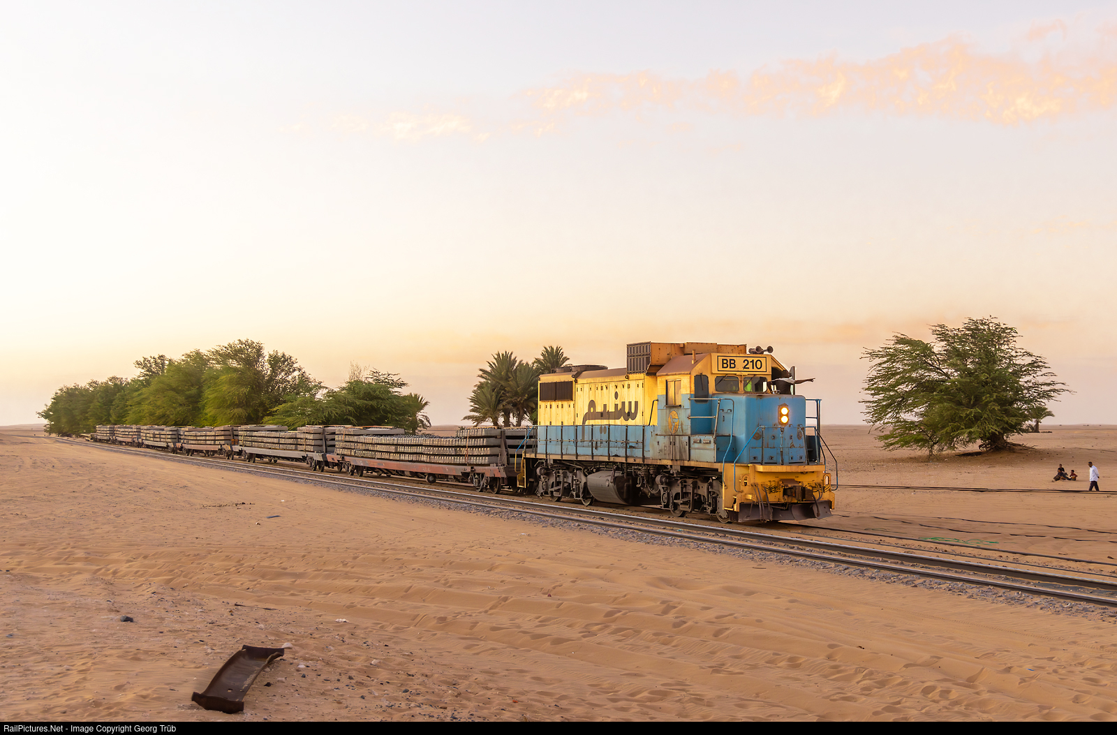 | Arrival of a work train loaded with new concrete ties from Nouadhibou in Boulenouar (PK 96) in the evening. The SNIM has a own tie production work in Nouadhibou. The train was parked overnight and went to the open line the next morning for unloading. Pulling was the GPL-15T BB # 210 built in 2008 by EMD in La Grange, Il. |