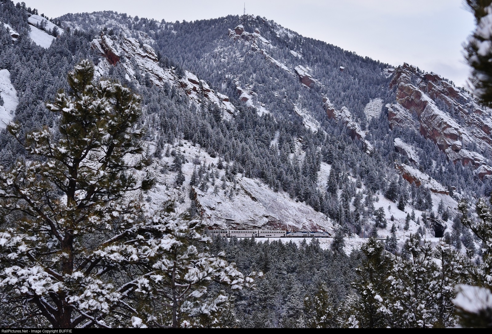 The Amtrak Winter Park Express Ski Train gets ready to enter Tunnel #2 as snow falls across the Colorado Front Range.