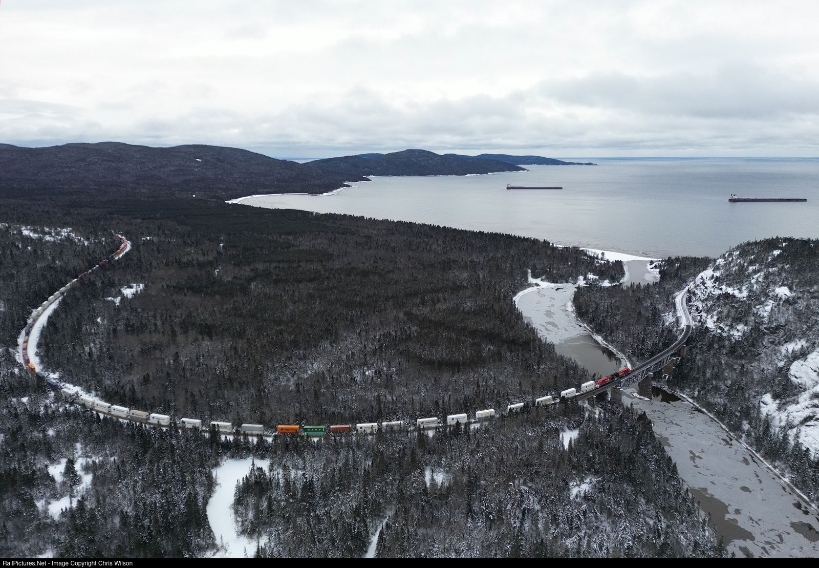 Train 113 from Montreal to Vancouver makes its way through Neys Provincial Park heading across the trestle spanning the Little Pic River. Storms on Lake Superior have a pair of footers (1000' boats) anchored in Ashburton Bay. To the right is the American Century and to the left is the Walter J McCarthy Jr.