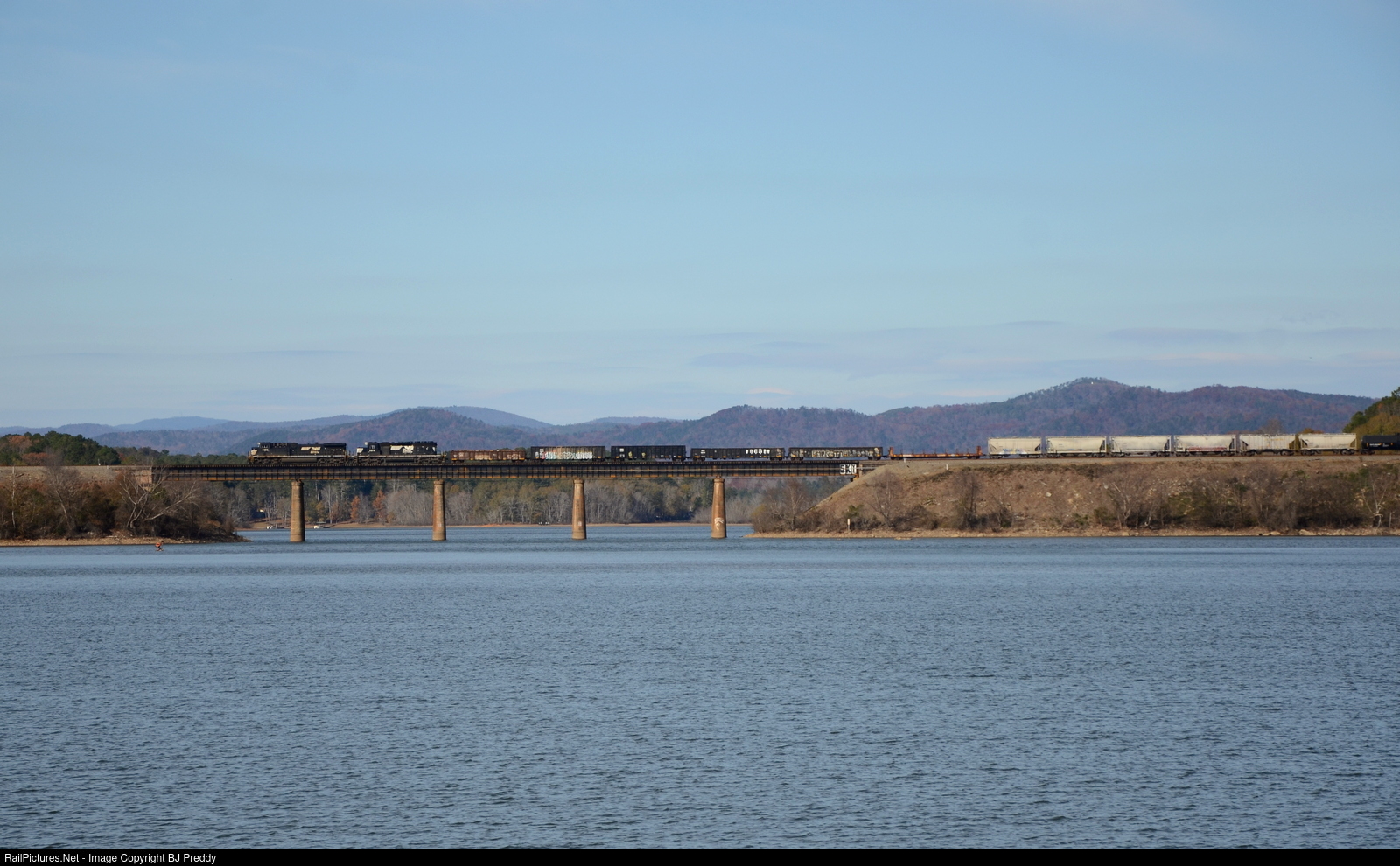 NS 153 crosses the Tugaloo River and enters the State of Georgia with a NS AC44C6M and a NS SD40-2.