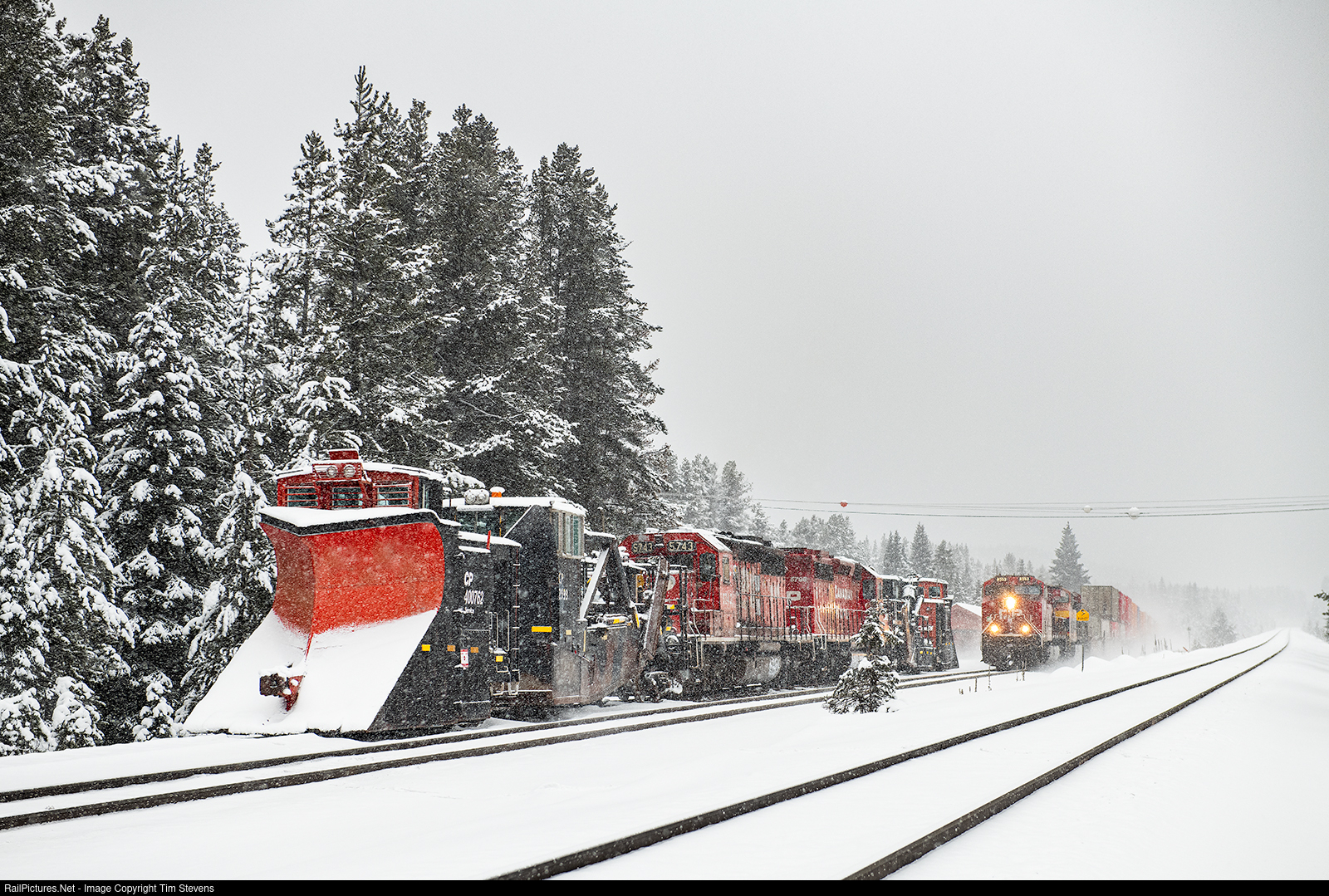 Vancouver IMS-Montreal St. Luc train 112-19 speeds past the Lake Louise based snow plows.
