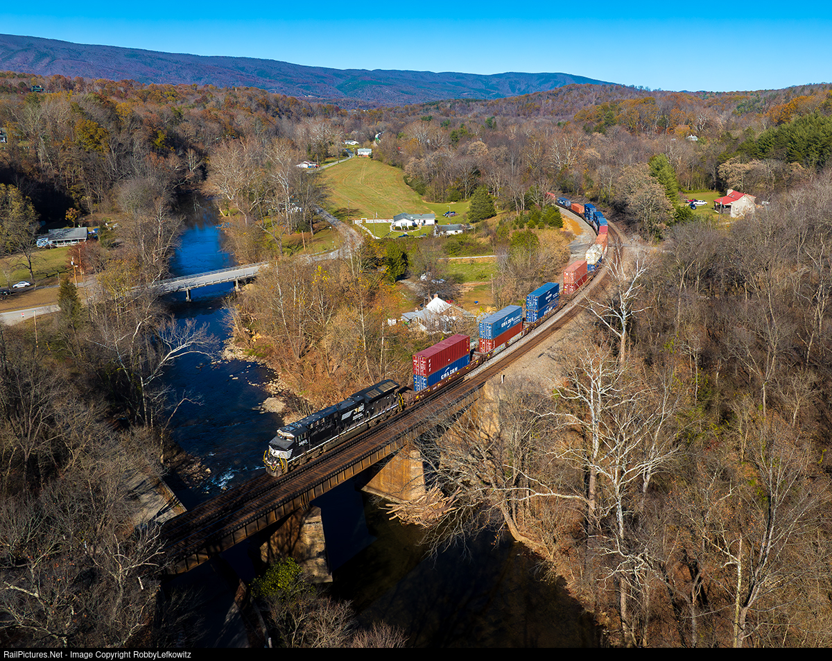 Stack Saturday: NS 3663 leads westbound intermodal train NS 279 through Wabun, Virginia, along the NS Christiansburg District and over the Roanoke River.