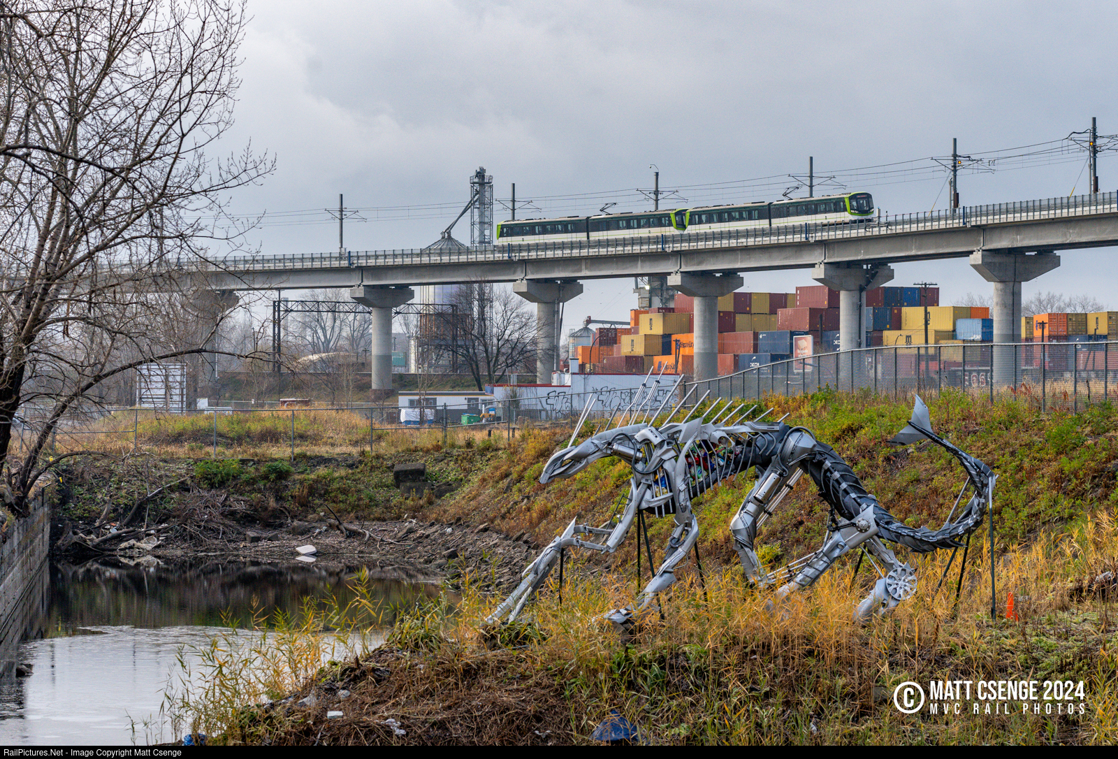 An inbound Réseau express métropolitain (REM) train is seen high above the industrial section of the Pointe-Saint-Charles neighborhood of Montreal as it makes its way towards Gare Centrale. Car 037D12 is the lead unit on the four-car automated train, a Metropolis Saint-Laurent model manufactured by Alstom for the brand new railway. The sculpture in the foreground is River Monster by Junko (2024), an unsanctioned sculpture installation made entirely out of local waste material. |