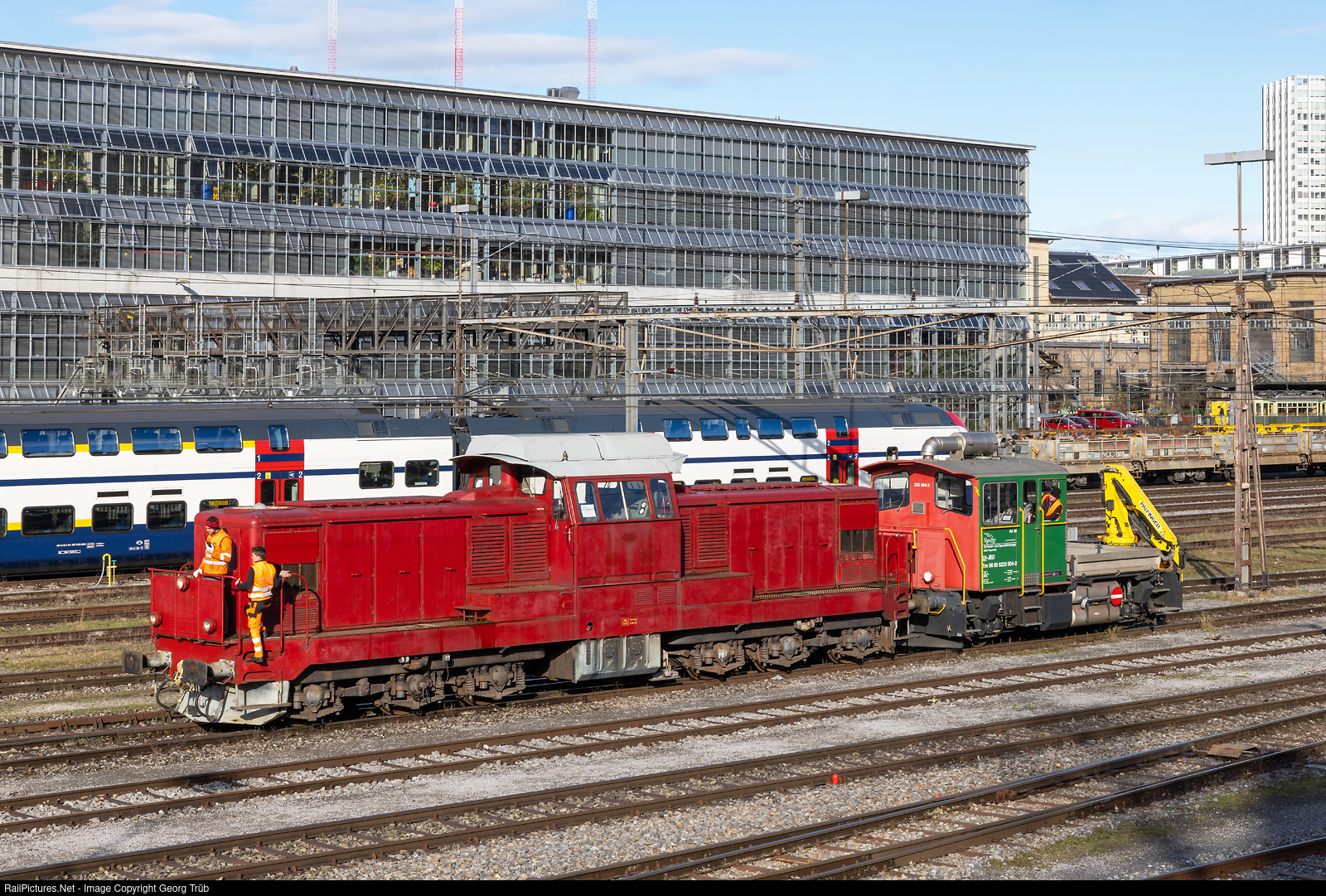 Former SBB diesellocomotive Bm 6/6 # 18511 (Bm 860 CH-VRLS # 98 85 5860 511-5) of the Association Rangierlok Schweiz (VRLS), operational, shunted by diesel tractor Tm 232 # 004 of Stauffer (JÜST), operated by Historic Rail Services (HRS) in Winterthur freight yard.