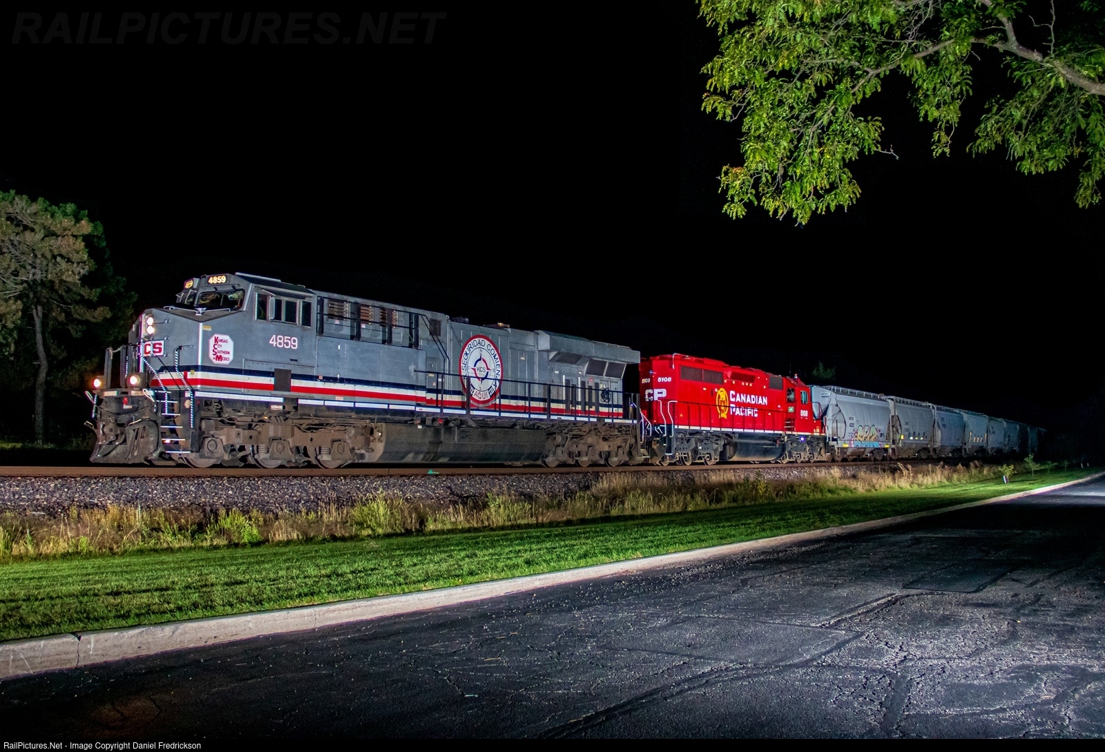 KCS 4859 (ES44AC) leads CPKC 246 through Des Plaines, IL, with CP 5108 (SD40-3) trailing. The lead locomotive is Kansas City Southern's "Safety Starts Here" promotional unit, emphasizing the need for employee safety in railroad operations. The paint scheme is unique in how the "Safety Starts Here" message is applied to both sides of the unit - on the engineer's side, it's in English, while on the conductor's side (seen here), it's in Spanish (covering both the U.S. and Mexican sides of the KCS operation). Incidentally, this train had multiple issues enroute (including a separated air hose), causing the train to not pass until just before 2 am.