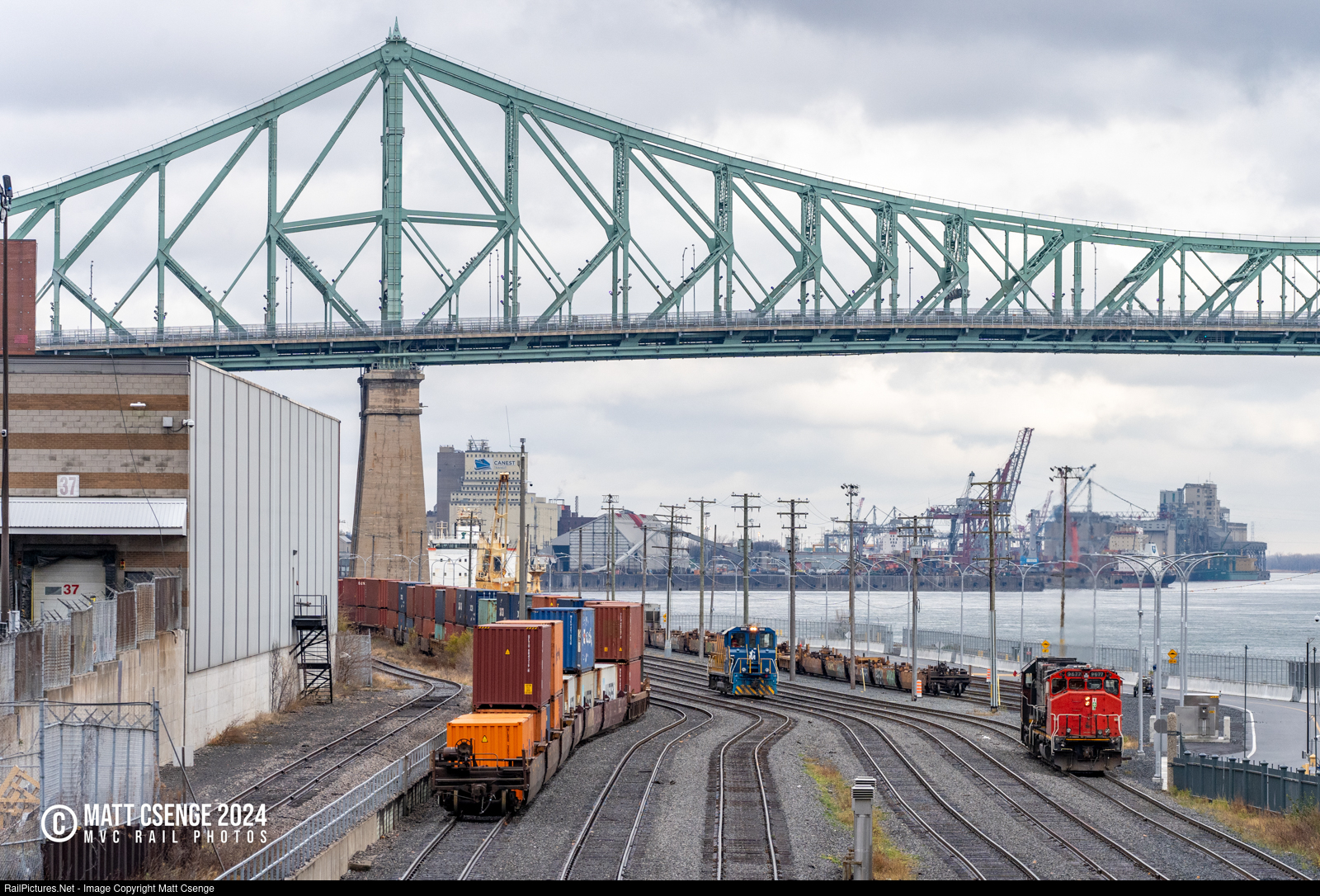 Port of Montreal Railroads. Canadian National (CN) GP40-2L no. 9677 and Port of Montreal Railway (PDMX) RP20BD no. 1002 are seen shuffling around the interchange yard at the Port of Montreal, with the Jacques Cartier Bridge looming large overhead. Catching the port locomotive was a surprise treat, as it came down from the port, changed tracks, and headed back up out of view all within just a few minutes!