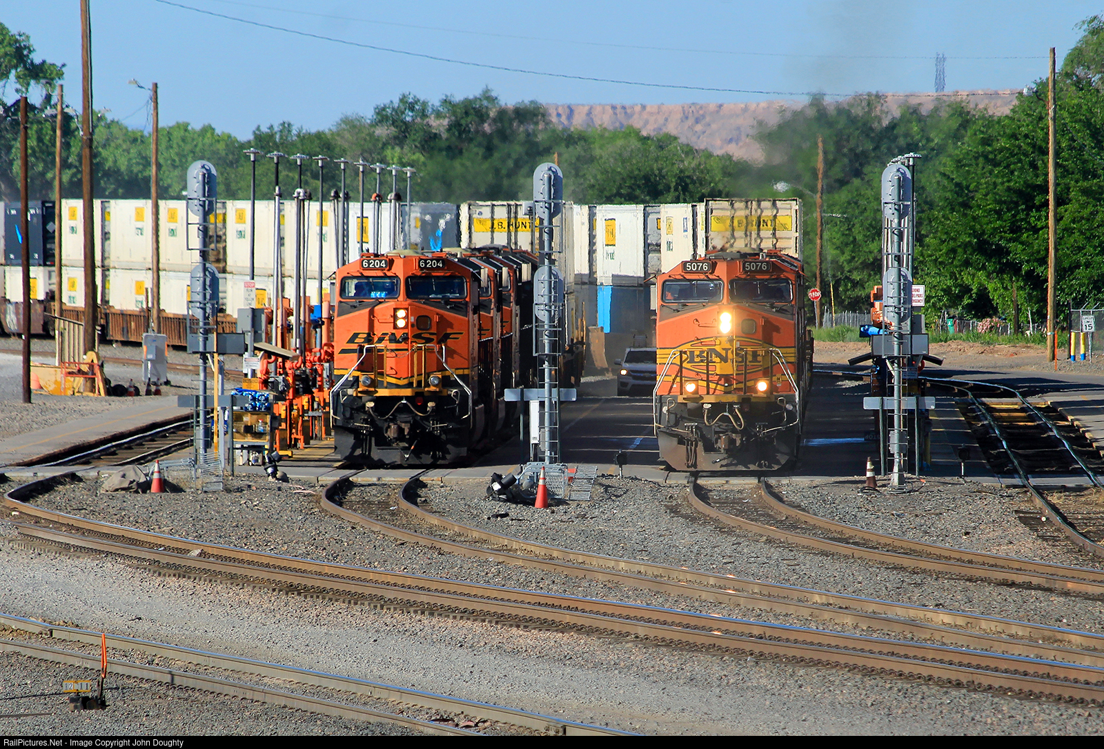 | BNSF 5076 begins to pull away from the fuel racks at the Belen yard with a westbound double stack. To the left, BNSF 6204 takes on fuel and will soon follow the BNSF 5076 out of the yard. |