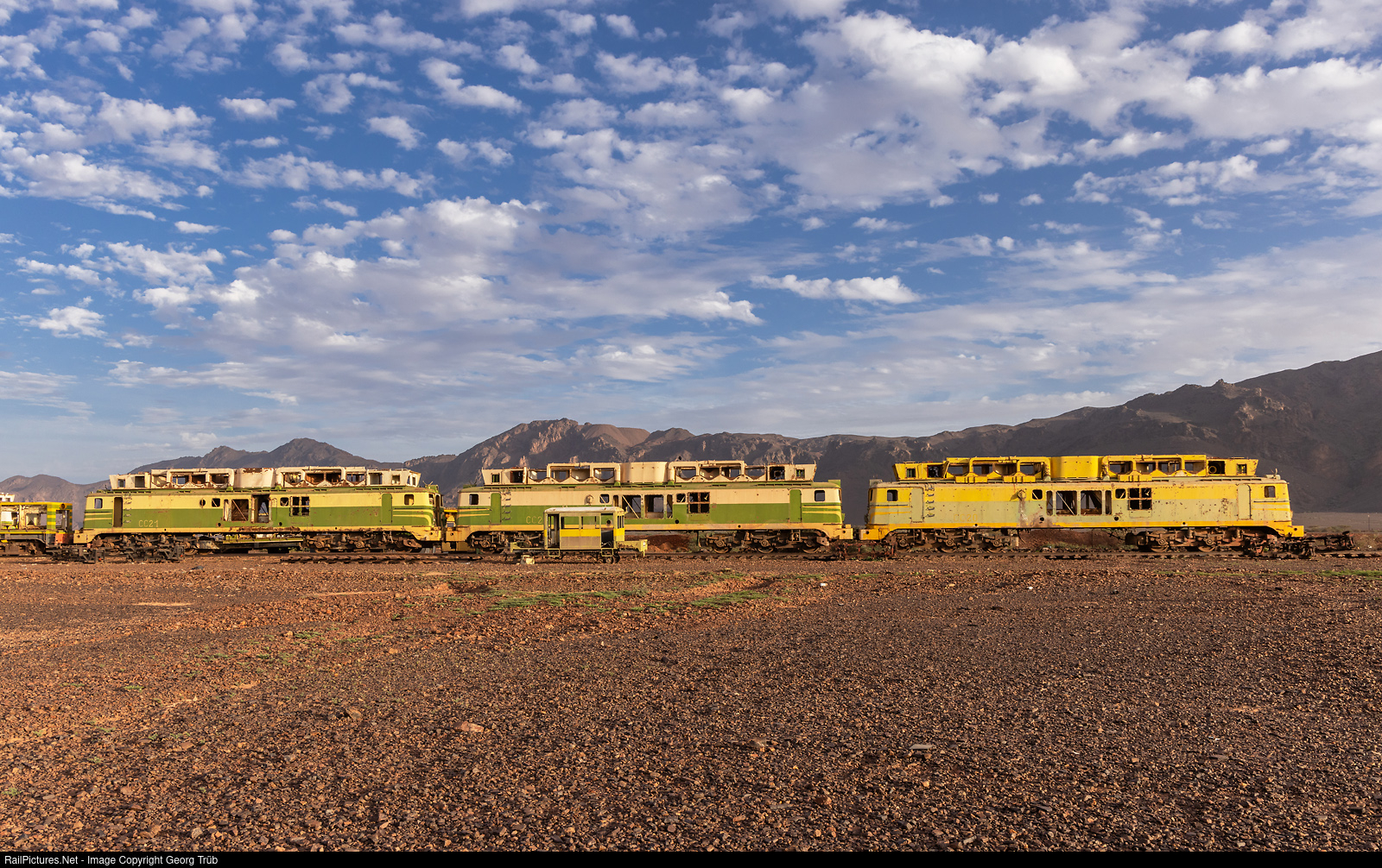 When the approximately 650 kilometer long line from the port of Nouadhibou to the ore mine near Zouérate was built in Mauritania between 1960 and 1963, MIFERMA (Société anonyme des Mines de fer de Mauritanie) procured two series of six-axle diesel locomotives from Alsthom in France, the CC # 01 to # 21 (built 1961 to 1965) with two SACM prime movers each. Around 1973/74, 5 more locomotives of the same type were built, the CC # 22 to # 26. The MIFERMA CC were based upon the SNCF Class CC 65000, a French passenger diesel locomotive also built by Alsthom. However, the MIFERMA locomotives had more powerful versions of the two SACM engines with a total output of about 2700 HP. They were also equipped with a roof mounted "skyline casing", which housed special filtration equipment, to deal with the unusually sandy and dusty Saharan atmospheric conditions. Another change which made them differ from the CC 65000s was their use of different bogie trucks (these being related to the trucks used on the CC 14000s) and a lower carbody with cabs taken from the CC 7100s. The cabs were slightly altered as they featured an extra center cab door on each end. The 26 locomotives were then supported from 1981 by the first american SDL40-2 locomotives from EMD and gradually replaced with the procurement of further locomotives from the USA. Most of the CCs were used until around 1997 for the iron ore trains, the last one, CC # 19, until 2009 in passenger service. The locomotives with their huge sand filters on the roof were not dismantled and melted down, but simply cannibalized and stored. Most of them can still be found today, namely 20 wrecks at F'derîk. The locomotive in the front row from left to right are CC # 21, 22 and 20. Five more MIFERMA CCs stand near the SNIM workshop in Nouadhibou.