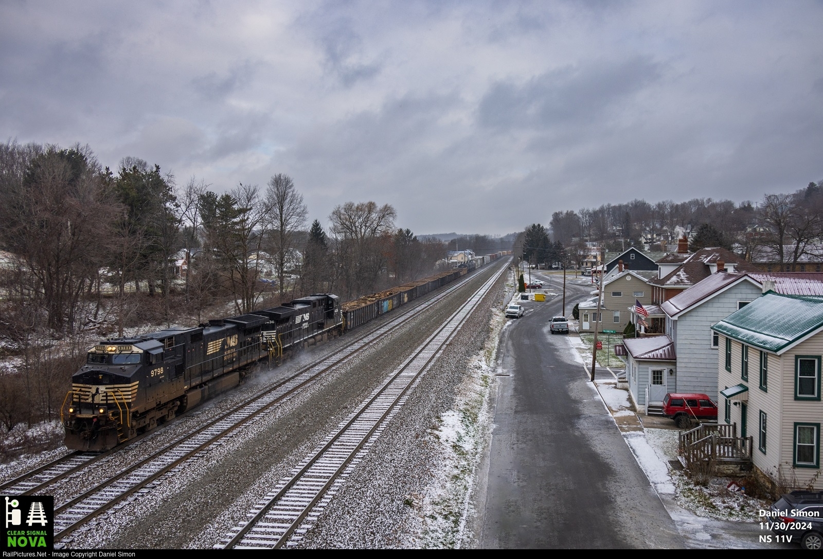 It's 18 degrees as Norfolk Southern Train 11V rolls through Lilly, PA on the NS Pittsburgh Line. The lead unit was a dash 9 which is a nice sight. The opportunities to see them unconverted are waning. Many have already been converted, such as the trailing unit.