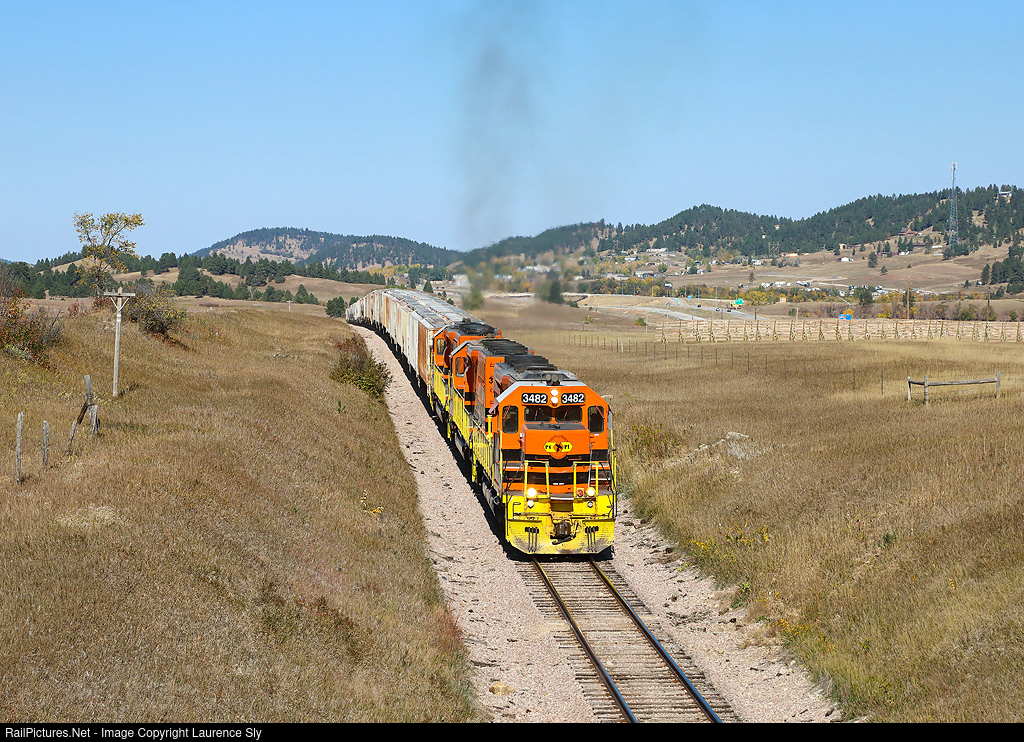| 3482, 3438 & 3467 approach Tilford whilst hauling LBFRC, the 'Belle Turn' from Belle Fourche to Rapid City, 12 Oct 2024 |