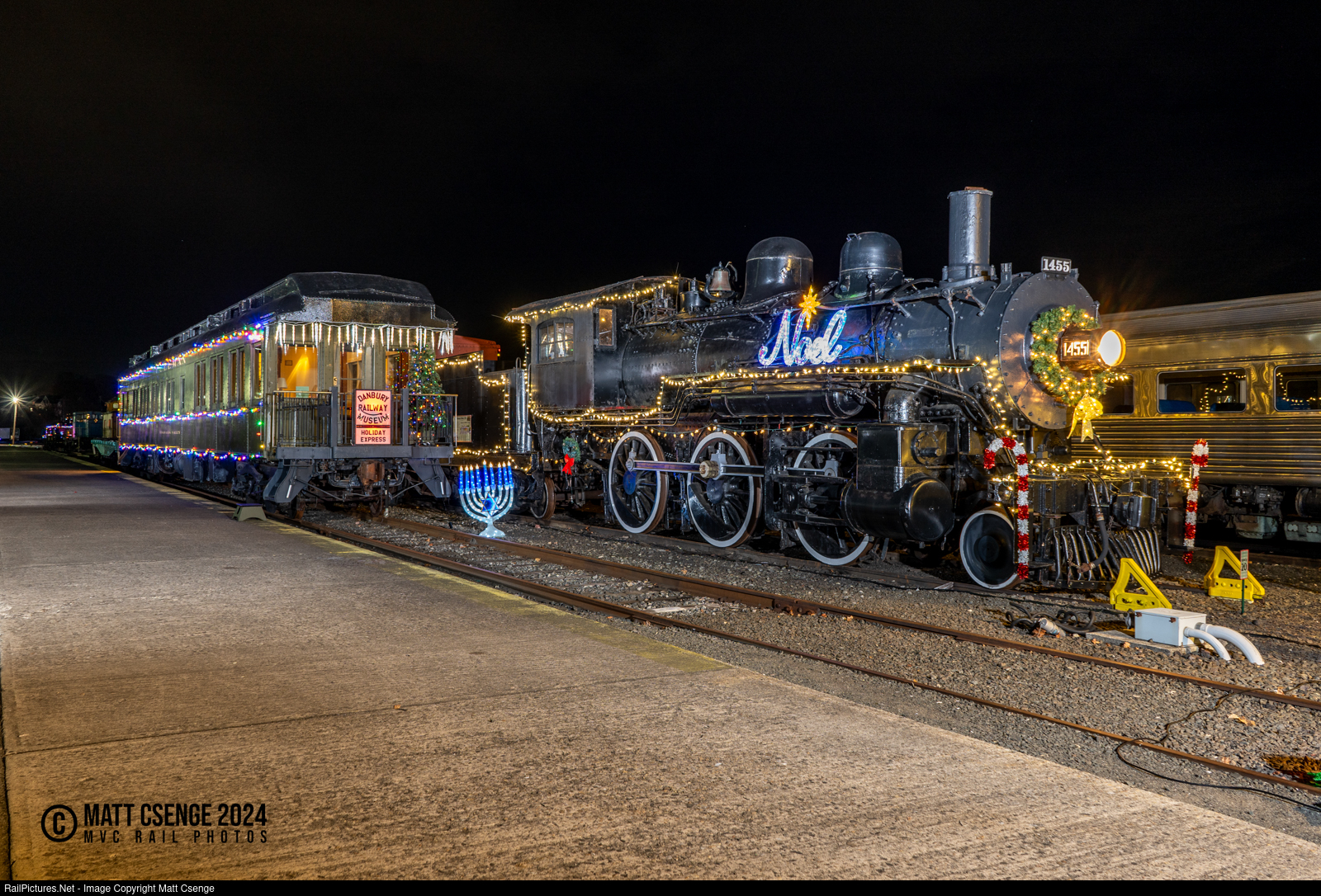 Holiday Express. The Danbury Railway Museum is holding their annual Christmas Fundraiser every Saturday and Sunday through December 22nd! The almost sold-out event features a ride through the rail yard on one of their historic Budd RDC cars, surrounded by other equipment that has been adorned with lights and decorations for the holiday season. Here we see Boston & Maine 2-6-0 locomotive 1455 and Pullman observation car Tonawanda Valley shining bright on the night of December 3, 2024.