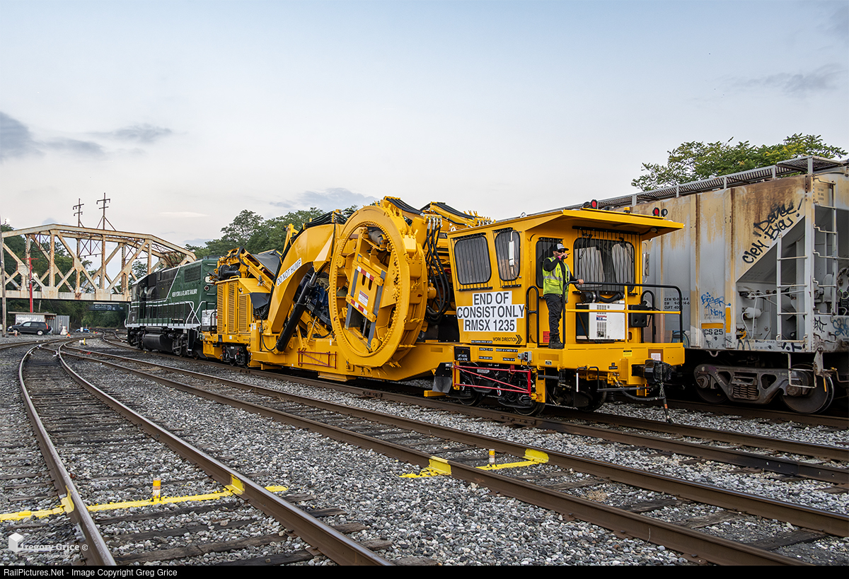 On the morning of October 5th, 2024, New York & Atlantic Railway RS-301, with EMD GP38-2 268, is seen shoving brand new Harsco Rail undercutter machine RMSX 1235 into the "East Yard" for interchange at Fresh Pond Yard in Queens, New York. The undercutter was recently acquired by the Long Island Rail Road for use on future track maintenance projects throughout their system.