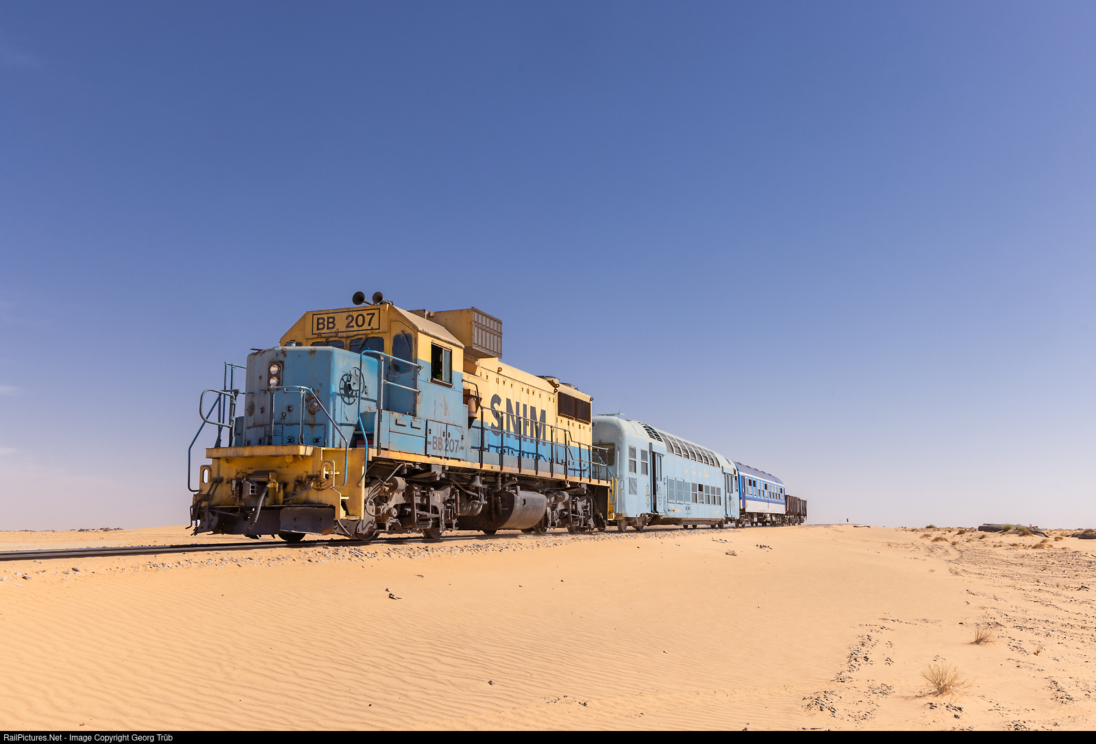 | The "Train du Désert" in the middle of nowhere of the Mauritanian desert, on the today about 6 hours journey from Ben Amira (PK 393) to Boulenouar (PK 96). Behind the GPL-15T BB # 207 is the doubledeck saloon car, the former diesel railcar A2n # 001 built in 1982 bei Cafici in Italy and in Mauritania since 1997. Behind is a former czech passenger car, rebuilt to a couchette coach. In the rear are two empty ore cars serving as brake cars. The two passenger cars have no brake any more. |