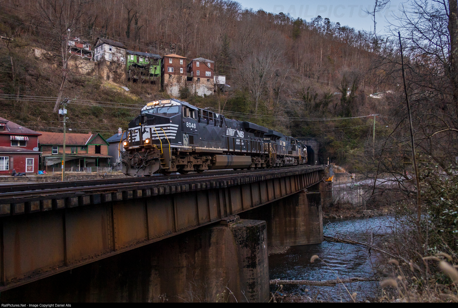 | Another 11E, this one lead by an ES44AC, rushes west through Welch, WV after the sun has gone over the mountain for the day. |