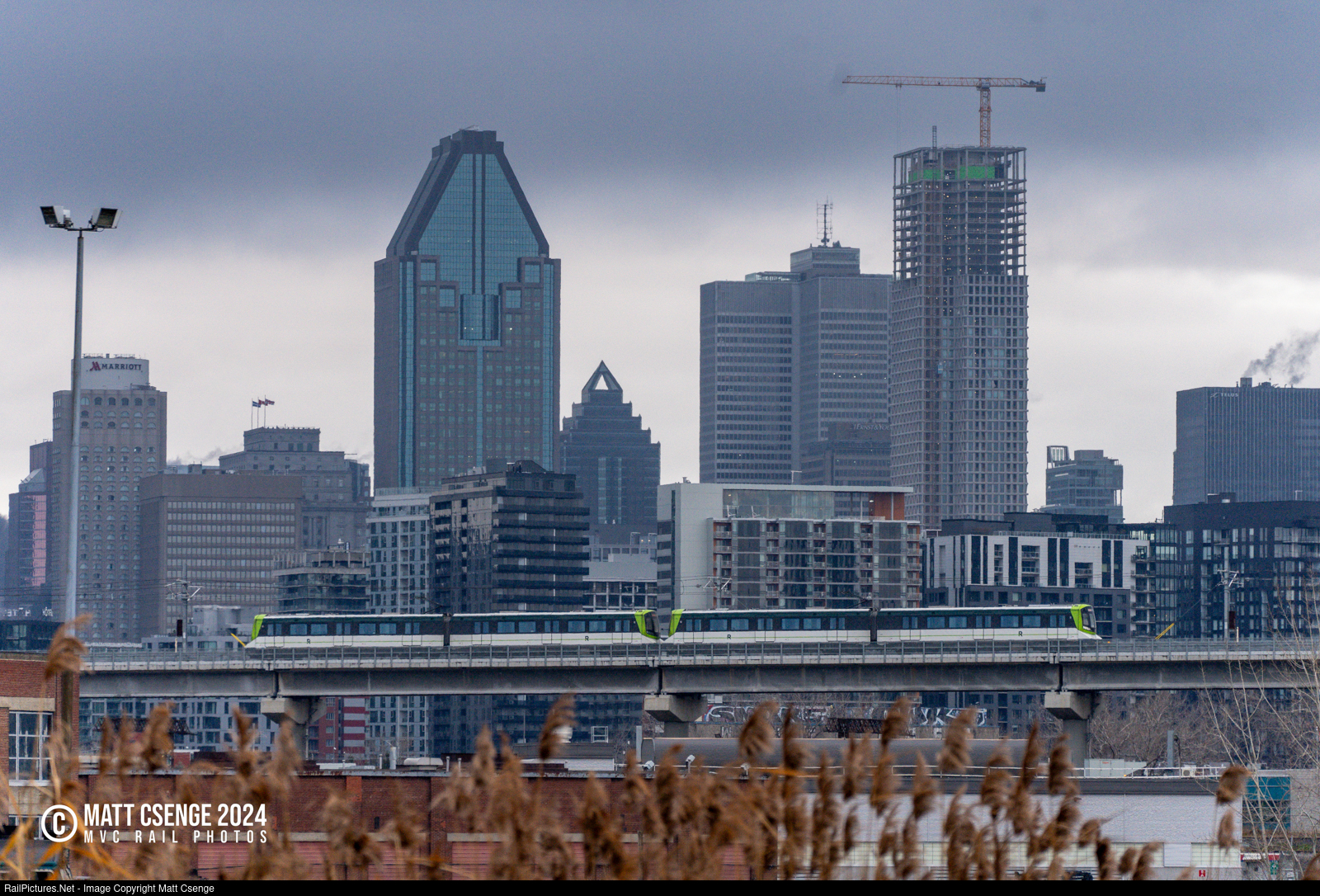 An outbound Réseau express métropolitain (REM) train is seen cruising over the Pointe-Saint-Charles neighborhood of Montreal, with the city skyline standing tall in the background.