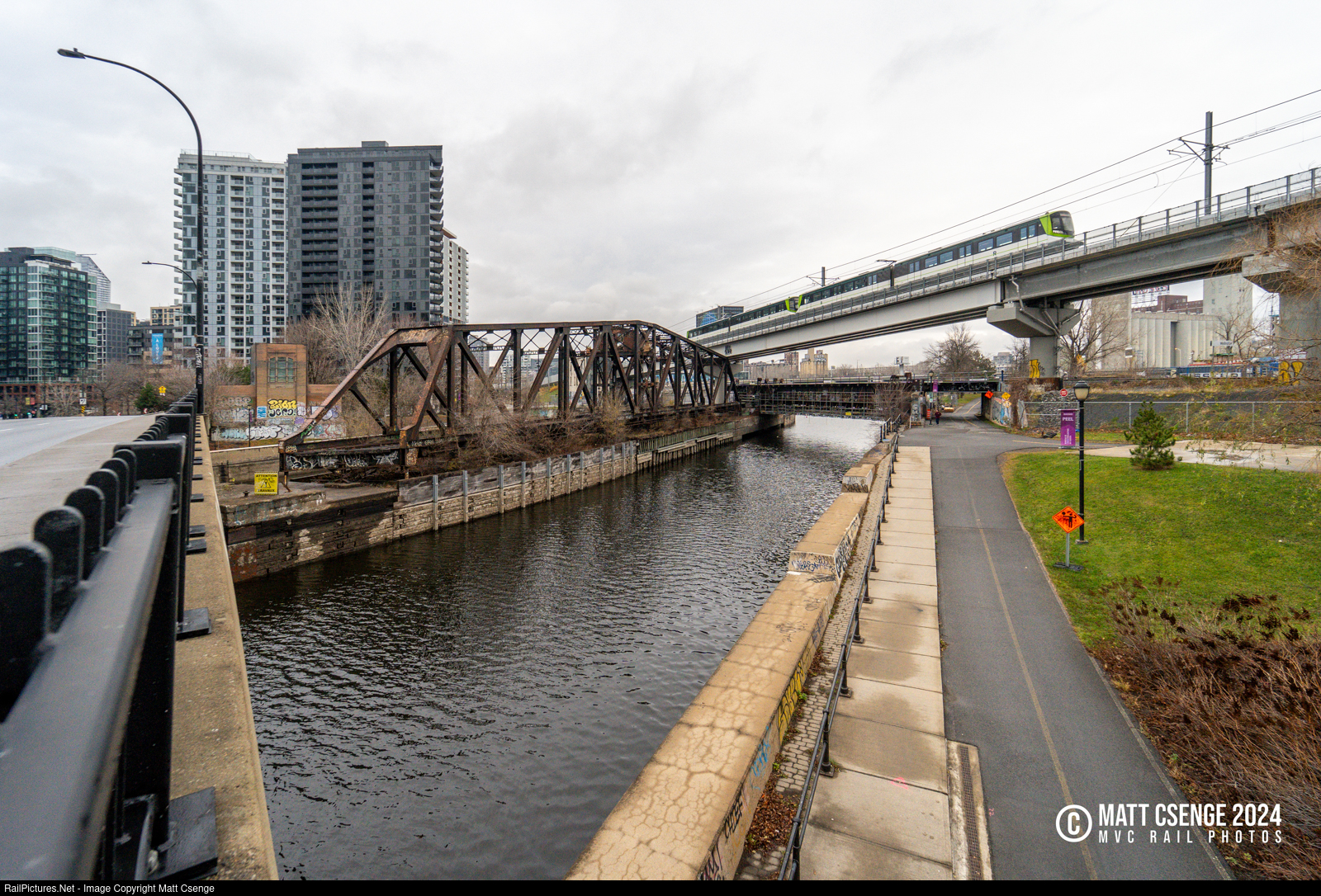 Canal Crossings. An outbound Réseau express métropolitain (REM) train is seen crossing the Lachine Canal as it makes its way out to Brossard. Adjacent to the new railway is the abandoned Wellington Bridge, which once carried tracks across the canal. Mainline service now uses the fixed span below the REM structure to cross and enter Gare Centrale.
