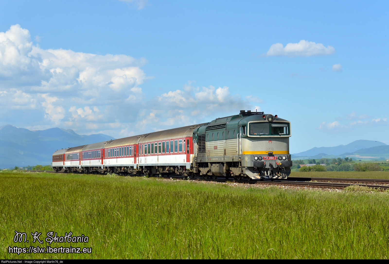 The diesel locomotive 754.084-2 hauling a passenger train from Ostrava Svinov to Zvolen hl. st.
