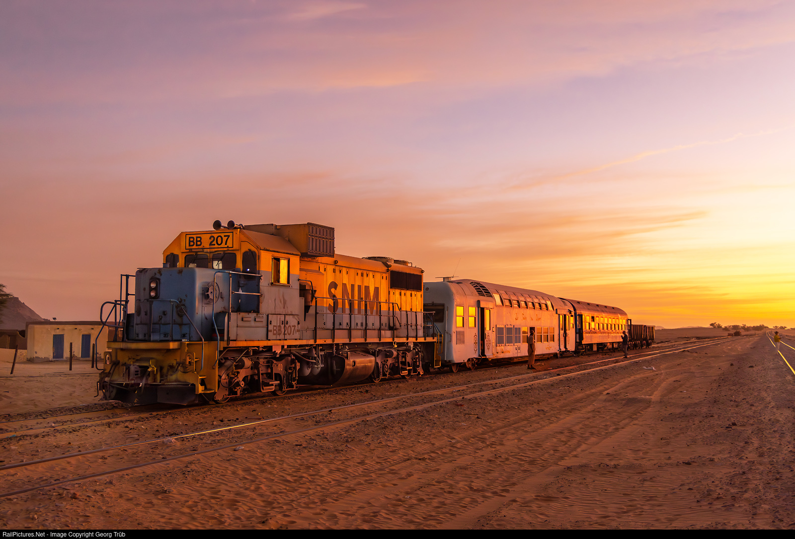 | The "train du Désert" arrived early in the morning, still in dark, the station of Ben Amira, after a 259 kilometer night journey for the swiss SERVRAIL group from Zouérat. Now it is slowly getting light and the sun will soon rise in the east. |