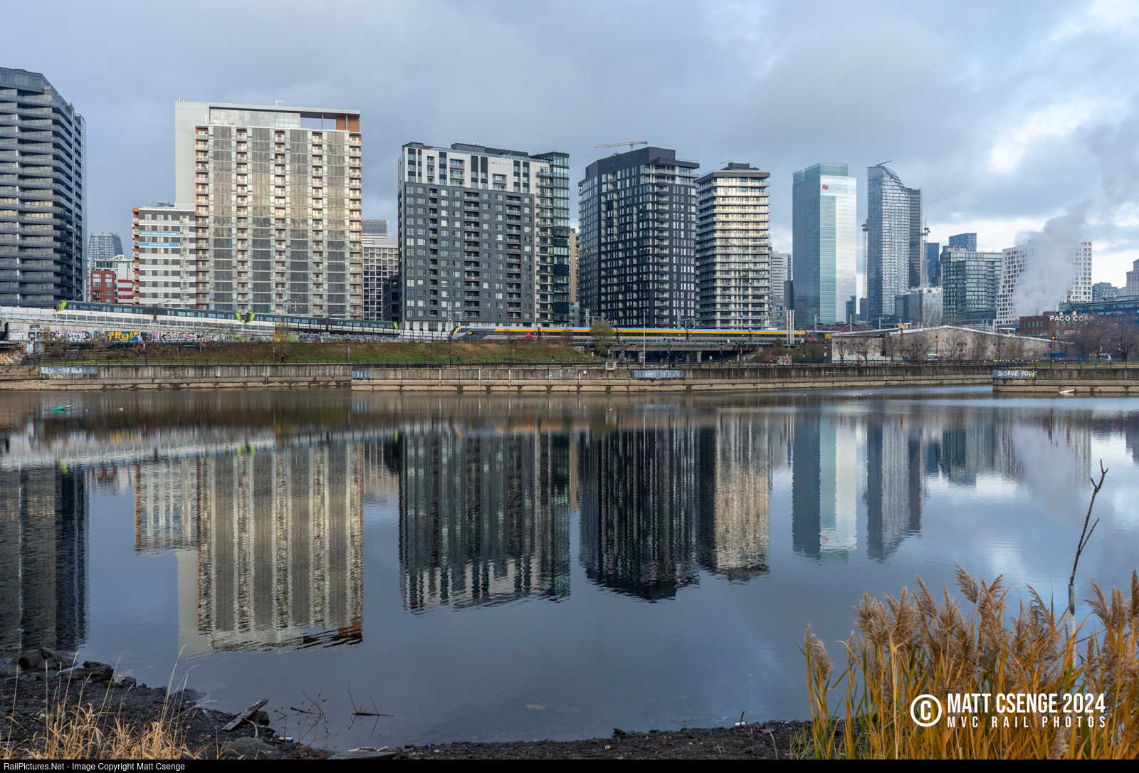 Modern Meet. VIA Rail Corridor train 63 is seen heading out of Gare Centrale, bound for Toronto, while a Réseau express métropolitain (REM) train approaches in the opposite direction. The railroad has come through this area for a very long time, though this is a much more modern view as the REM started operation on July 31, 2023, and the Siemens Venture trainsets entered service on VIA in 2022.