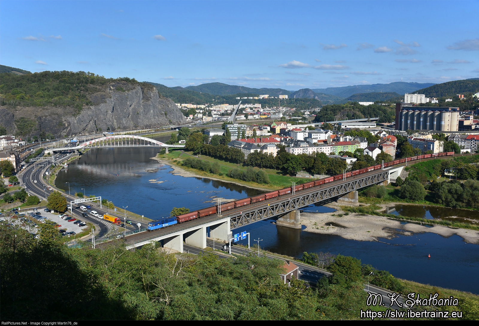 | The electric locomotive 130.029-3 hauling a freight train passing over the bridge over the Lab river and at the same time entering the Usti nad Labem zapad station. |