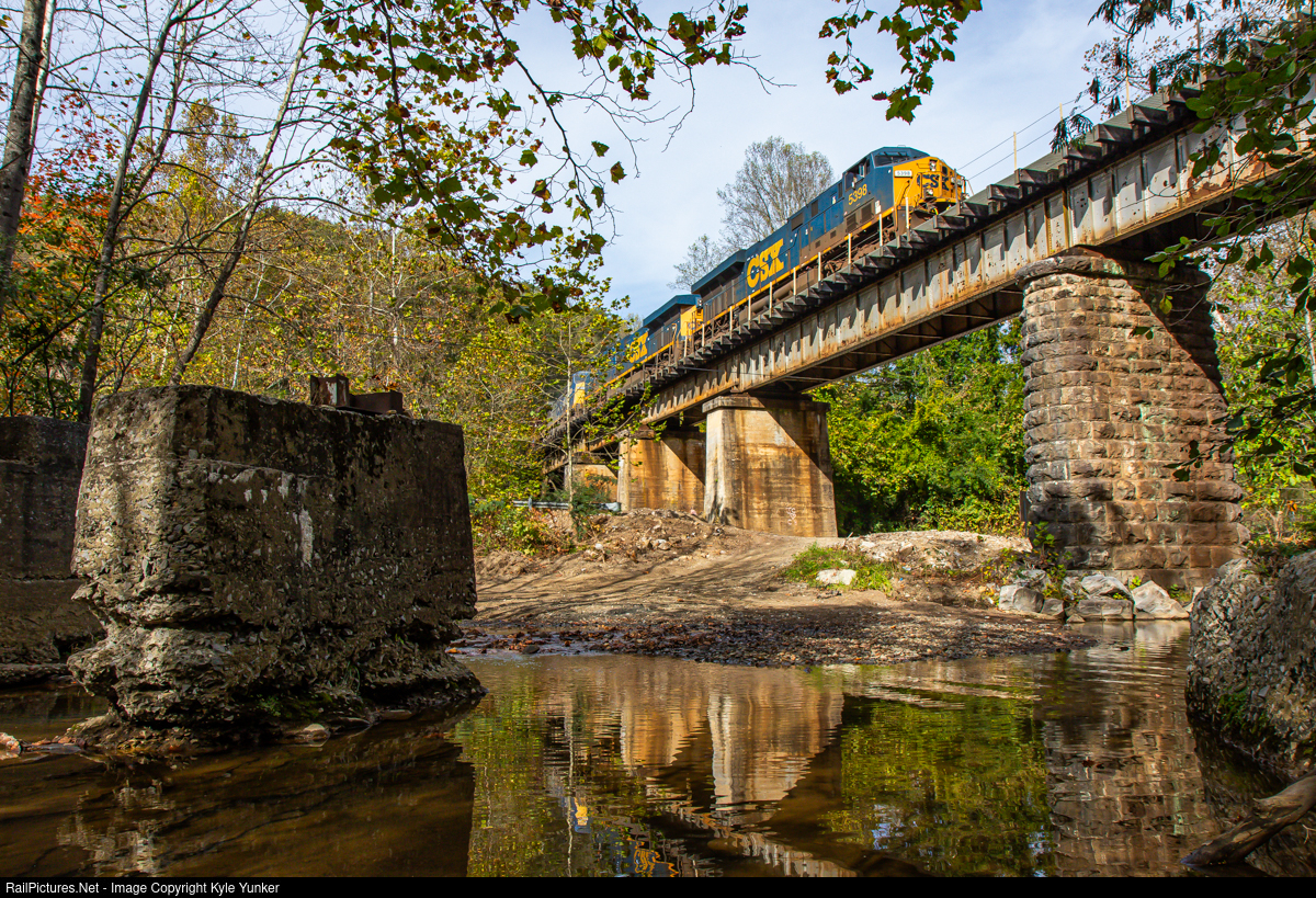 | CSX train Q541 rumbles south across Ollis Creek at Ivydale, TN on the KD Sub descending the Duff Mountain grade. The bridge supports in the foreground are from an old Southern Railway branch to a coke mine. |