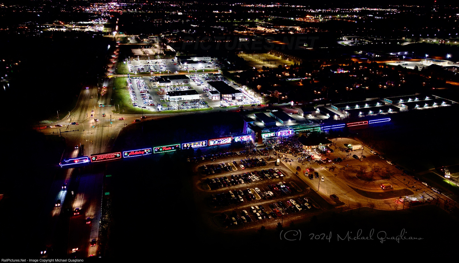 Perched above the charming town of Sturtevant, Wisconsin, a drone captures a stunning night view of the CPKC Holiday Train as it lights up the scene near the Amtrak Station, spreading holiday cheer from above.