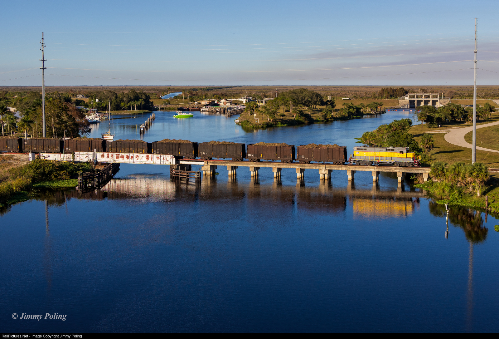 | USSC GP11 305 brings sugar cane loads eastbound over the Caloosahatchee River in Moore Haven, FL. The train picked up the loads just west of town and is taking them to the large mill in Clewiston for processing. |