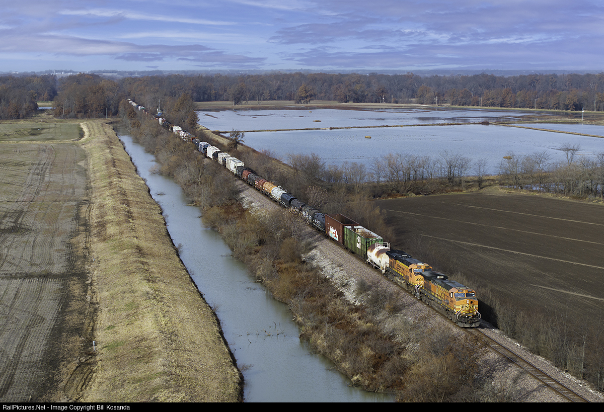 A BNSF manifest passing through flooded fields near O'Fallon, Missouri.