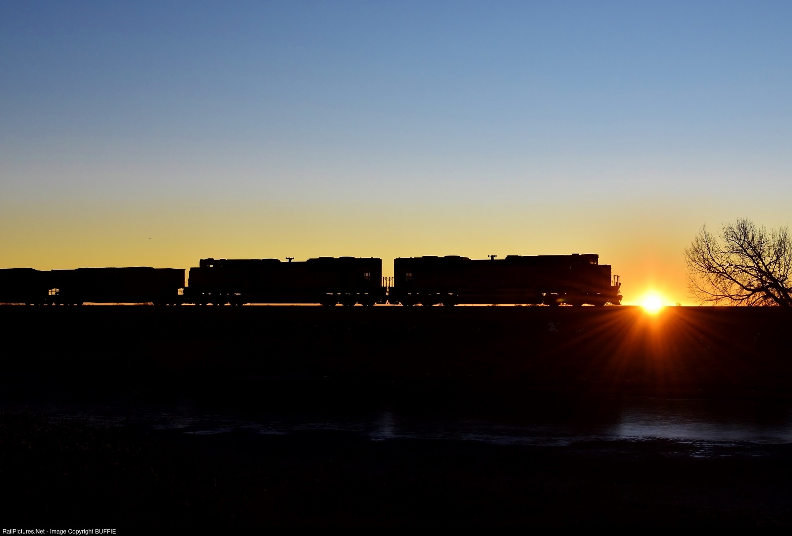 BNSF 8998 (SD70ACe) runs past Barr Lake at sunrise in Brighton, Colorado.