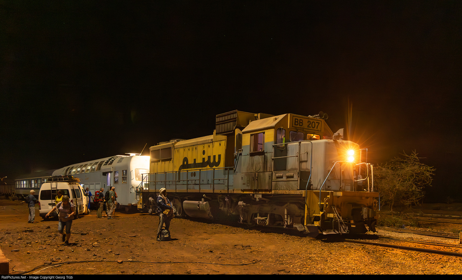 | The "Train du Désert" with the GPL-15T BB # 207 of the SNIM is ready for departure from Zouérate to Ben Amira, a night journey with the Servrail group from Switzerland. |