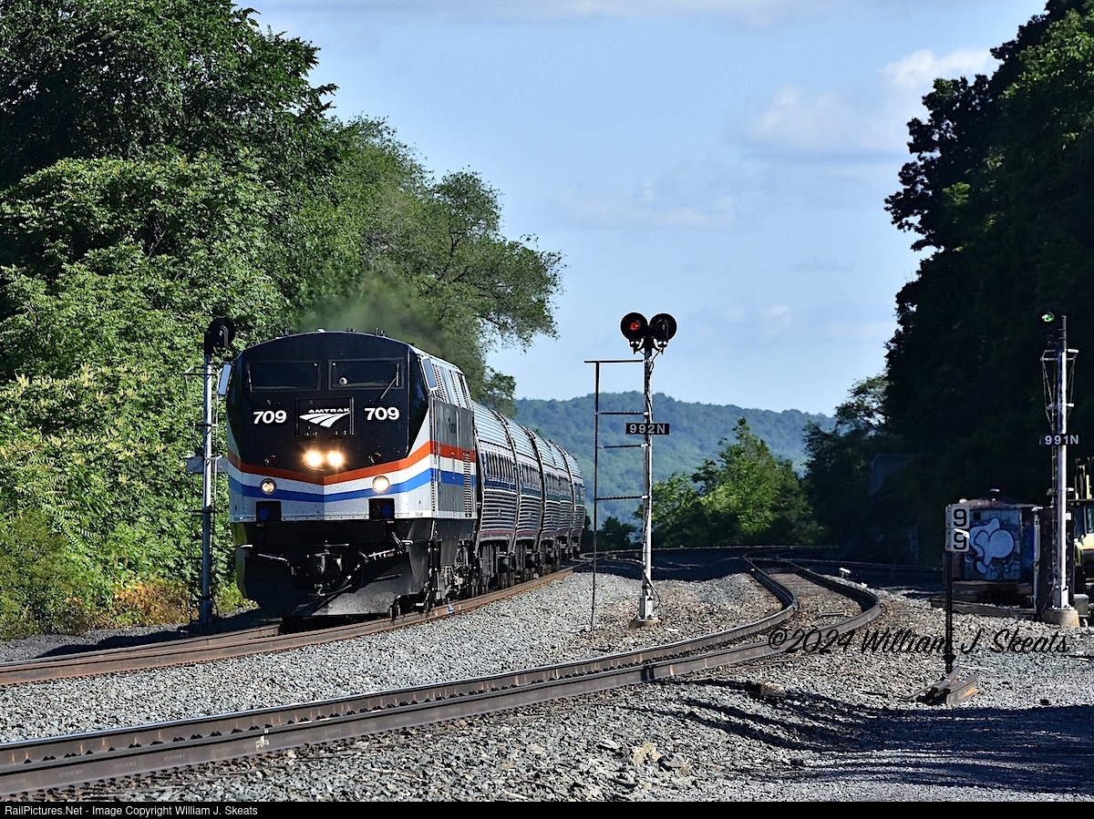 | Amtrak Empire Service Train 236 is splitting the former New York Central searchlight signals at CP 99. P32AC-DM 709 and five Amfleets heading south towards Poughkeepsie their next stop. |