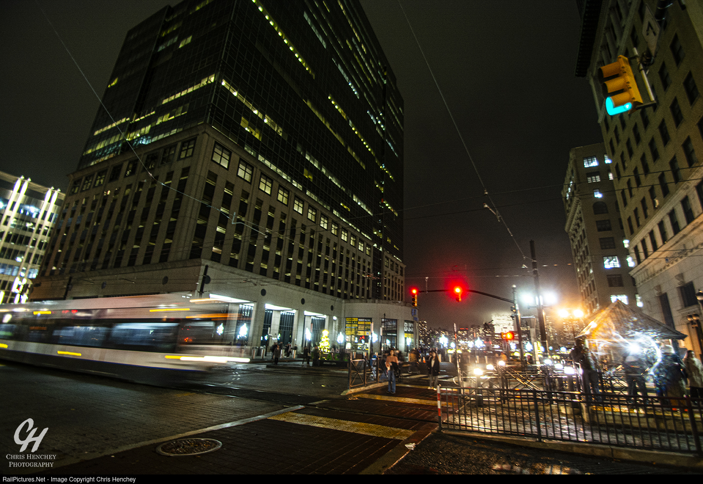 | The evening commute sees another HBLR train slow for more passengers at Exchange Place, near the Waterfront in Jersey City. What would typically be One World Trade Center in the background is shrouded in low clouds on this soggy December night. |