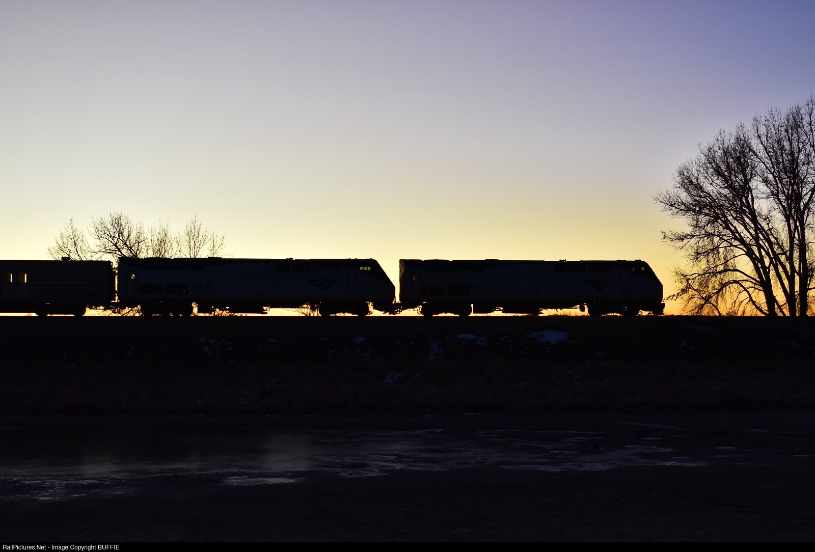 | The California Zephyr runs through Barr Lake at sunrise as it heads towards Denver, Colorado on the Brush Sub. |
