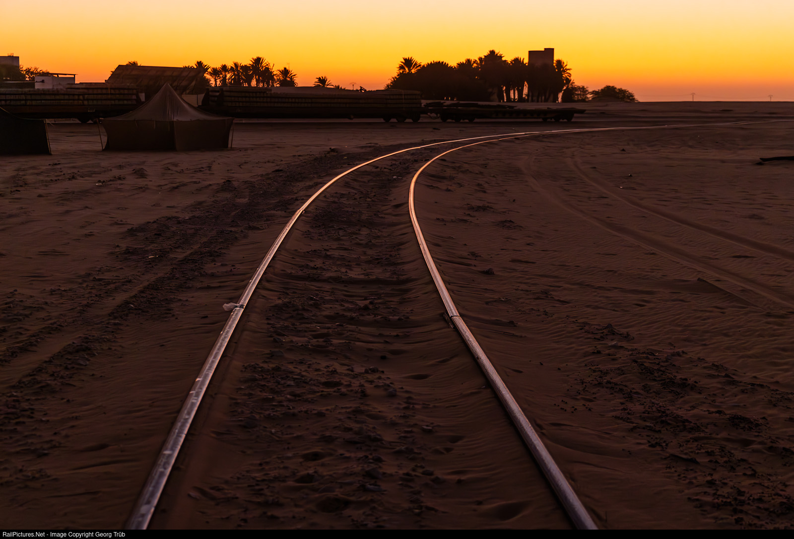 The sun sets at around 6.30 pm. There is a large supply of groundwater in Boulenouar, and 16 taps are set up at the station to fill the water tankers that supply the entire route with water. Later in the evening, a tanker train arrived from Nouadhibou, was filled here and the diesel locomotive drove around the train on the track visible here (turning loop).