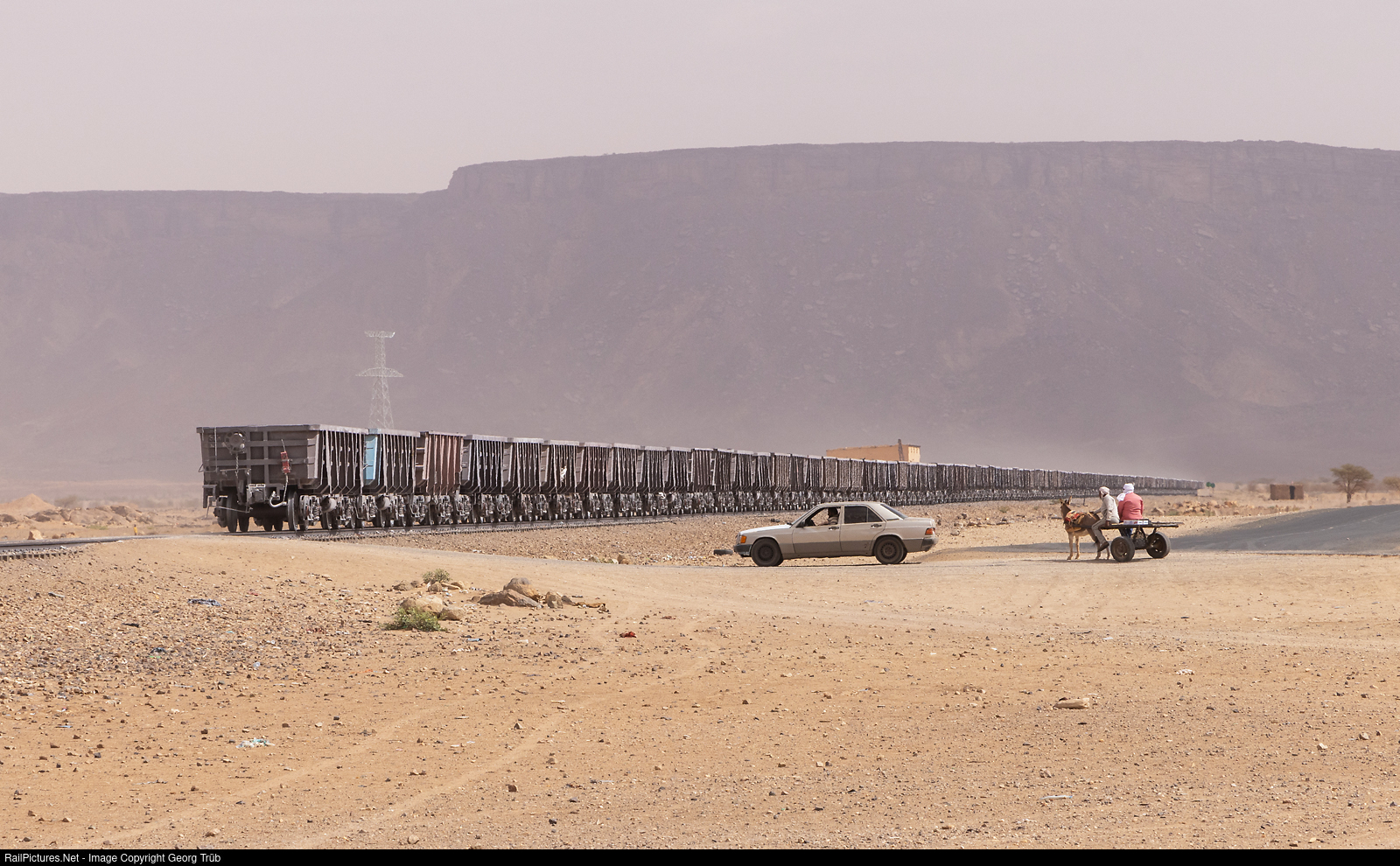 At Choum, at kilometer 460 of the 652 km long railroad line, the railroad makes a 90 degree turn, even before the mountain massif visible in the background, and then heads north to Zouérate instead of east. This is due to the border between Mauritania and the territory of Western Sahara. Since 1991, the railroad line has run for around 5 kilometers across the territory of Western Sahara (as does the paved road running next to it); previously, it ran through a 2-kilometer tunnel in the mountain massif to bypass the territory of Western Sahara.