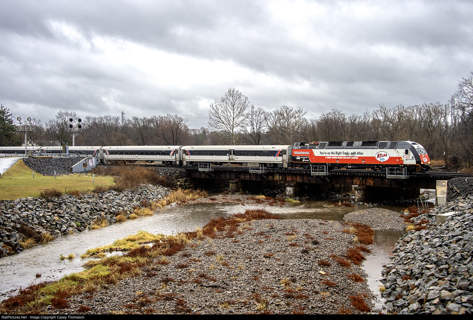 NJ Transit's specially-wrapped "Atlas Model Railroad" ALP45DP #4503 crosses Middle Brook as it departs Bound Brook, New Jersey, with train 5127 on the Raritan Line.