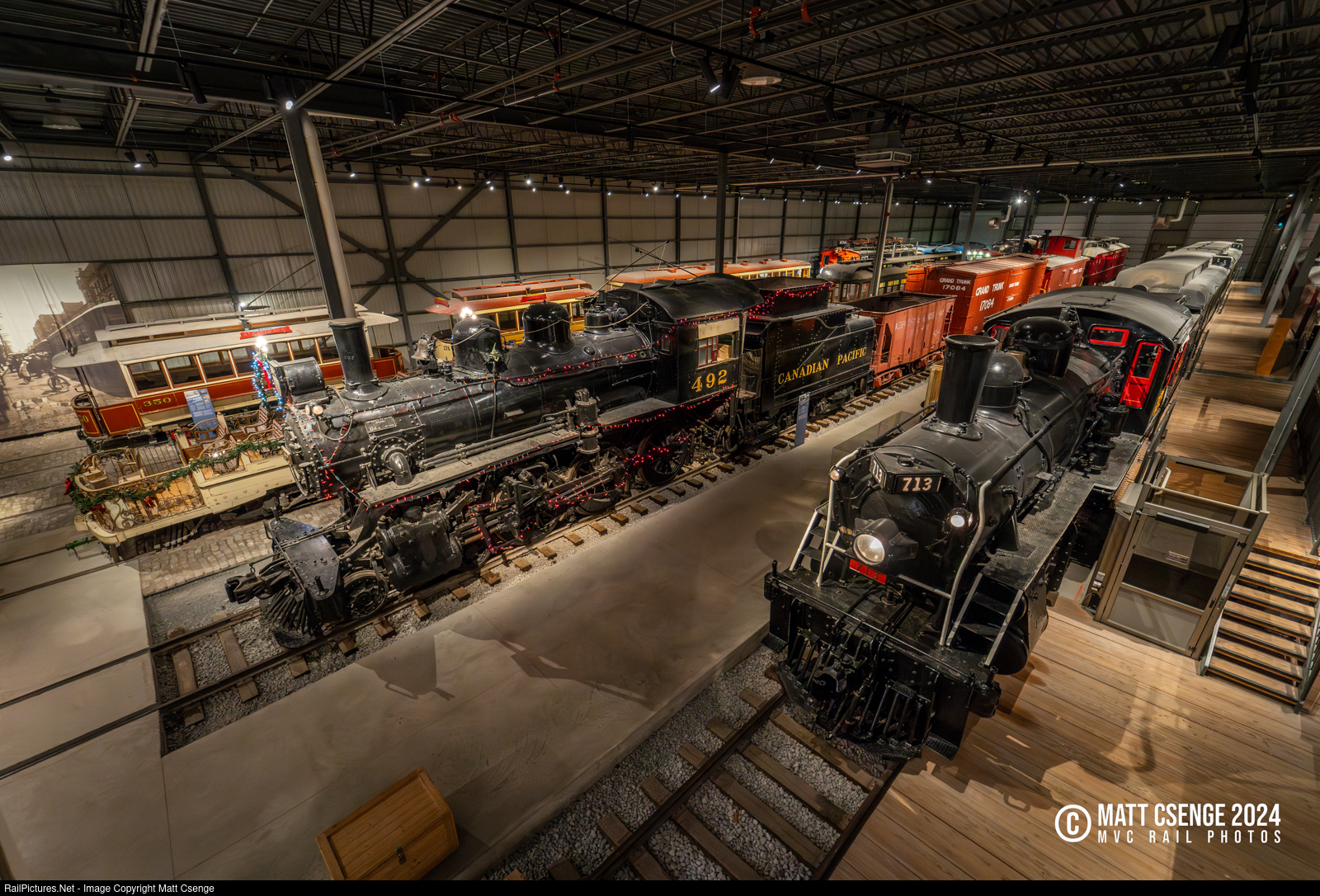 A variety of preserved equipment in seen on display at Exporail in this view from the second floor balcony. Canadian Pacific (CP) 4-6-0 no. 492 is front and center, Grand Trunk (GT) 2-6-0 no. 713 at right, and Montreal Tramways open observation car 1 and Montreal Street Railway car 350 at far left. Some of the equipment was decorated for the holiday season, as we were visiting on December 1! |