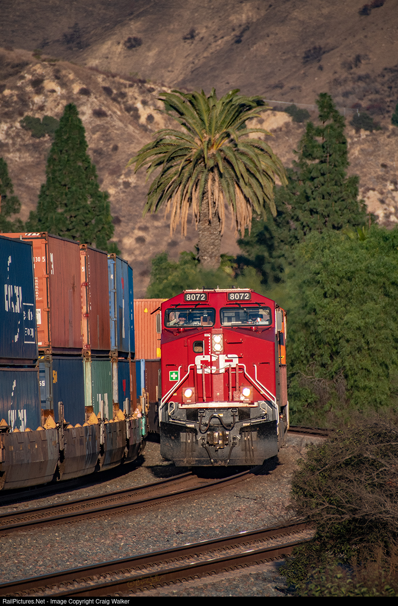 BNSF train S-LPKLHG1-11L heads for Los Angeles Harbor's Global Gateway South with an interesting locomotive on the head-end: Canadian Pacific AC4400CWM 8072 (the former CP AC4400CW 9536). This train is seen at Esperanza, the old Santa Fe "station" location at BNSF San Bernardino Sub's milepost 35.6, in a December climate that is completely foreign to a locomotive from above the 49th Parallel, as is that palm tree. This intermodal train originated at the Logistics Park in Kansas City KS. (Yorba Linda, California – December 14, 2020)